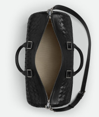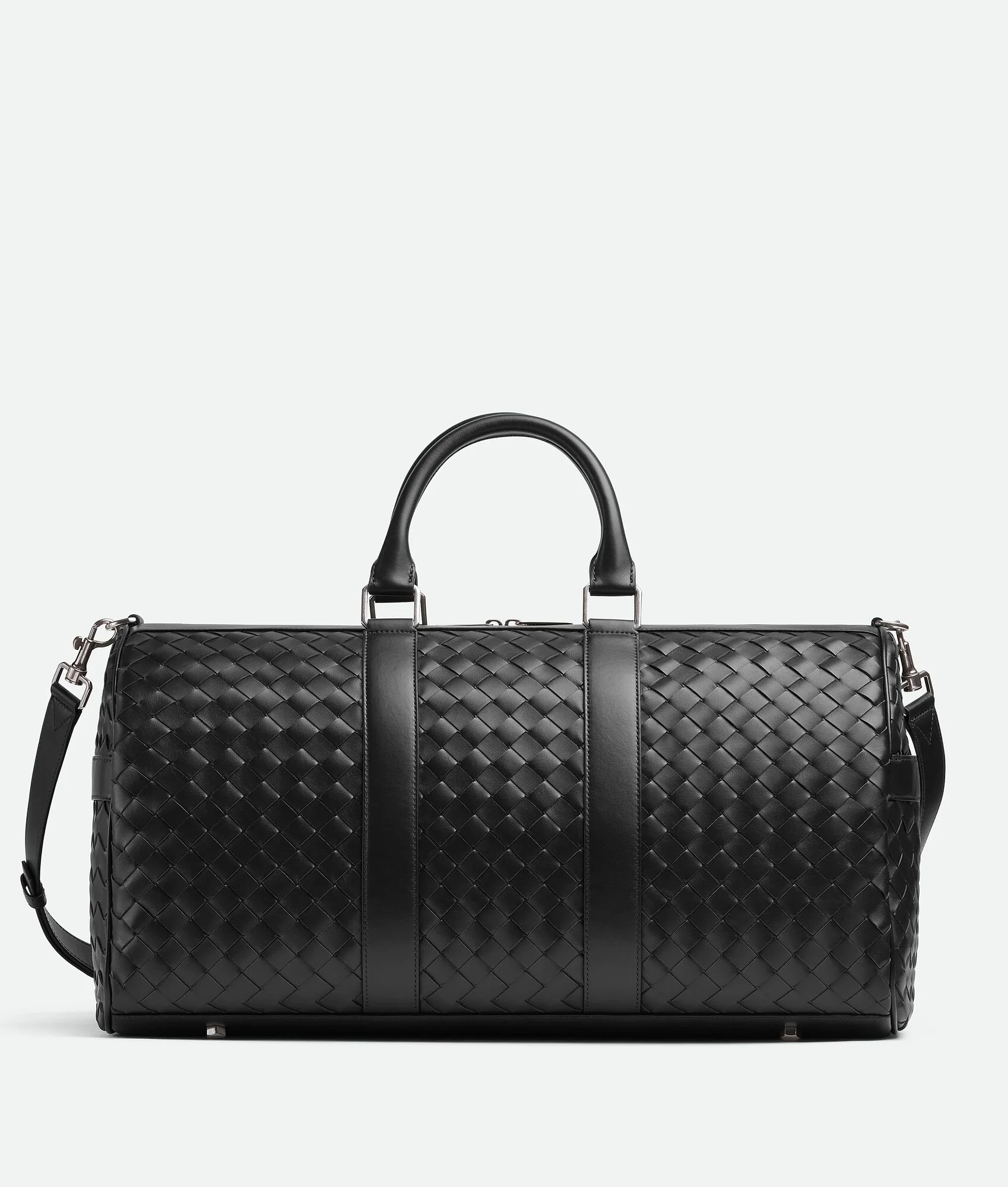 Archetypal duffle bag realised with Intrecciato craftsmanship in soft calfskin leather. Product details • Medium Intrecciato leather duffle bag with detachable strap • Single exterior side zippered pocket • One interior zippered pocket, double phone pocket • Zipper closure Material: Calfskin • Lining: Canvas • Color: Black • Hardware: Silver finish • Height: 27 cm | 10.6" • Width: 50 cm | 19.7" • Depth: 24 cm | 9.4" • Handle drop: 15 cm | 5.9" • Strap drop: 55 cm | 21.7" Made in: Italy