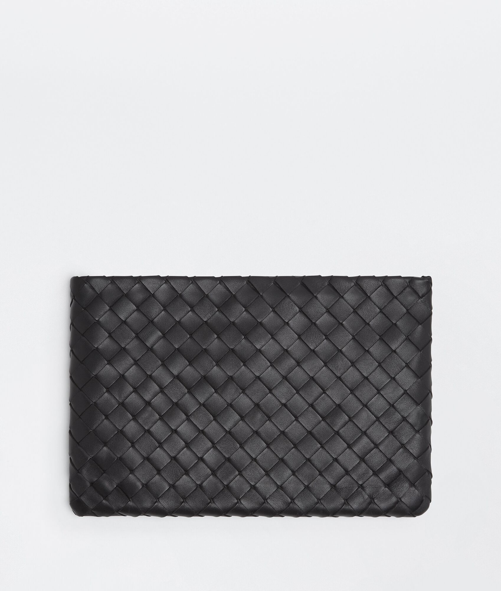 Medium intrecciato leather pouch. Product details • Medium intrecciato leather pouch • Six card slots, one additional pocket • Zipped closure Material: 50% Lambskin, 50% Calfskin • Lining: Cotton • Color: Black • Hardware: Gold finish • Height: 19.5 cm • Width: 29.5 cm Made in: Italy