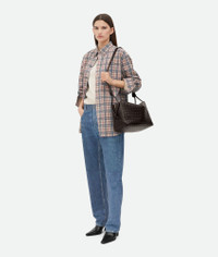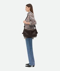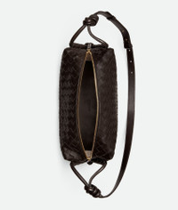 Intrecciato weekender with smooth leather strap featuring handmade leather knots. Product Details - Medium Intrecciato leather weekender with smooth leather strap adorned with four handmade leather knots - Single compartment - Single interior zipped pocket - Zip closure - Material: Calfskin - Lining: Canvas - Color: Fondant - Hardware: Brass finish - Height: 18.5 cm | 7.3" - Width: 38 cm | 15" - Depth: 20 cm | 7.9" - Strap drop: 48 cm | 18.9" - Made in: Italy - Product code: 796619V2HL12190