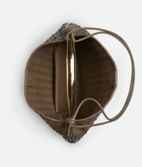 Shoulder bag made from supple lambskin leather using Intrecciato craftsmanship featuring Product details • Medium Intrecciato leather shoulder bag with metallic top handle • Single compartment • Magnetic closure • The metallic handle is crafted by artisans and showcases nuances and engraved markings making each piece unique Material: 100% Lambskin • Lining: Lambskin bonded Intrecciato • Color: Taupe Grey • Hardware: Brass finish • Height: 31 cm | 12.2" • Width: 39 cm | 15.4" • Depth: 12 cm | 4.7" • Handle drop: 12 cm | 4.7" • Strap drop: 39 cm | 15.4" Made in: Italy