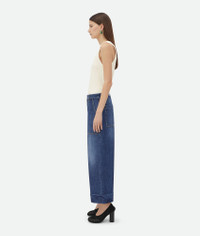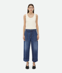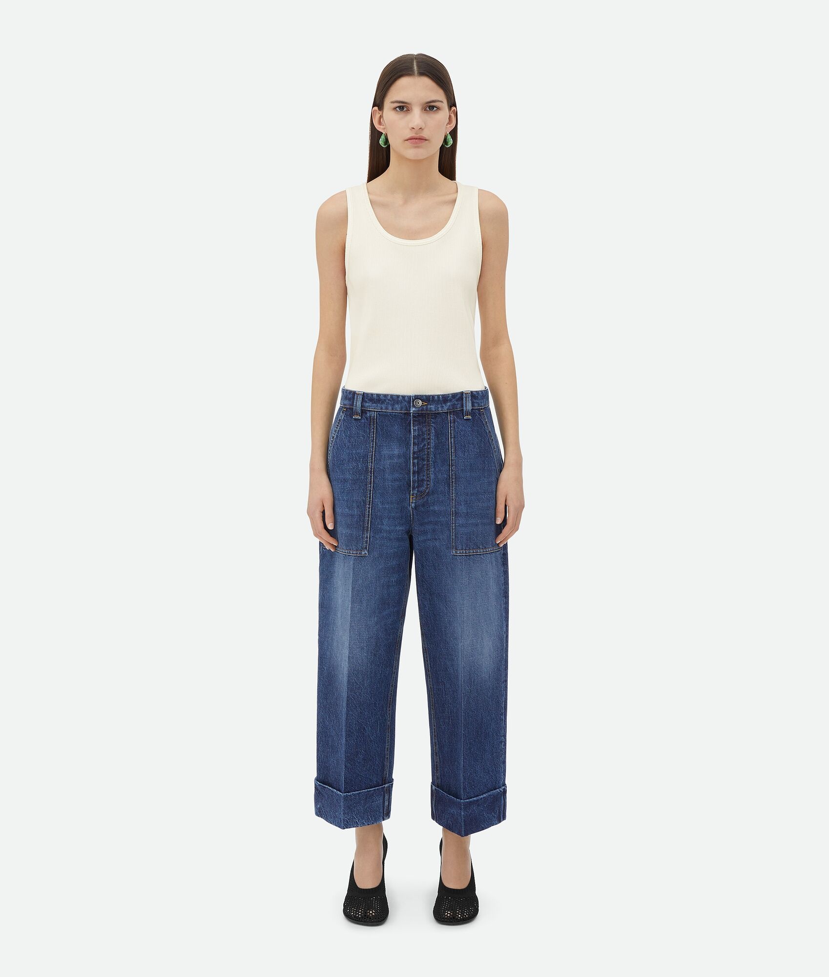 Cargo trousers with wide silhouette and rolled-up cuffs. Realised in medium washed Product details • Medium washed indigo cargo denim • Turned-up hem • Button closure • Wide leg Material: 100% Calfskin • Color: Mid Blue Made in: Italy