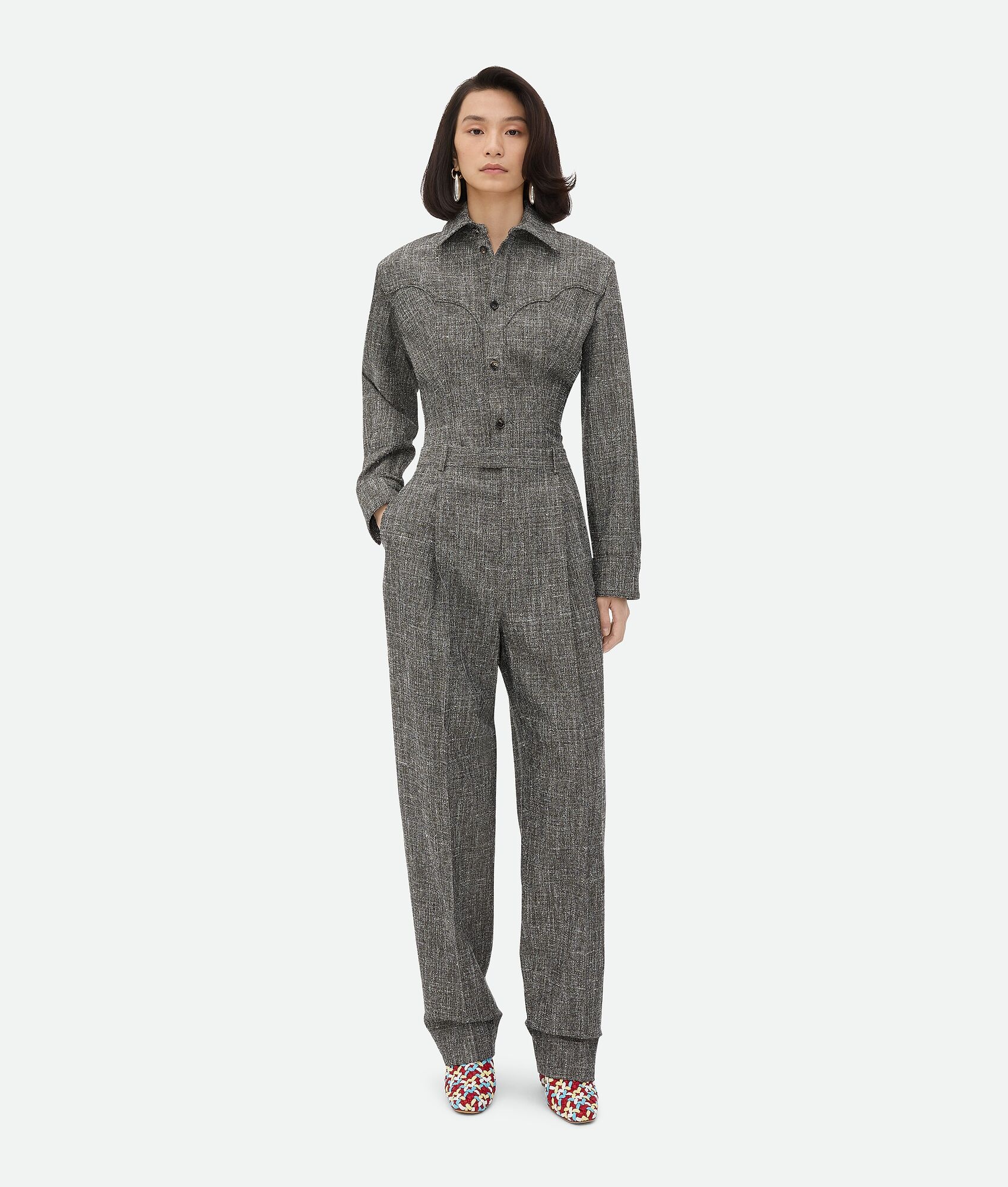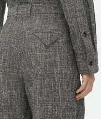 Trousers in textured melange viscose and silk. Product Details - Melange textured viscose and silk trousers - Wide leg - Sartorial internal waistband - Zip, hook, and button closure - Material: 25% mulberry silk, 20% wool, 19% viscose, 15% polyester, 13% cotton, 8% polyamide - Color: Brown/Grey/White - Made in: Italy - Product code: 823806V4XU01276