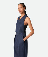 Gilet in melange wool drill featuring an indigo denim effect. Product Details - Melange wool drill gilet - Indigo denim effect - Button closure - Slim fit - Material: 100% Wool - Color: Dark Indigo - Made in: Italy - Product code: 834988V5VQ04023 Size & Fit - Model is 177 cm | 5'9" and is wearing a Bottega Veneta size 38