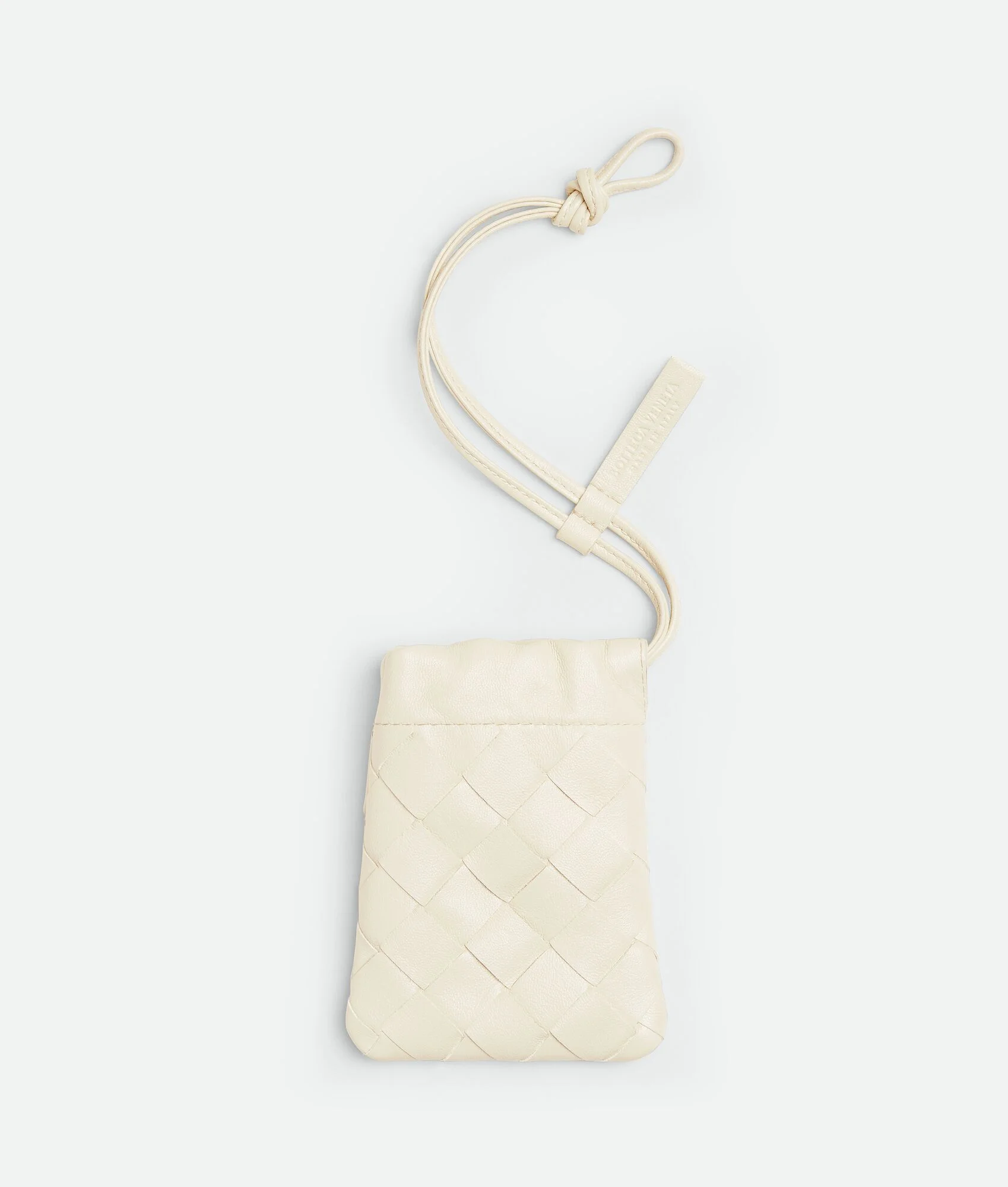 Micro Dustbag in Intrecciato calf leather with drawsting closure and loop attachment. Product Details - Intrecciato calfskin leather charm - One main compartment - Drawstring closure - Leather loop attachment with snap button - Lining: Nylon - Color: Sea Salt - Hardware: Gold finish - Made in: Italy - Product code: 843903V3IV09197 Material - Material: Calfskin Size & Fit - Height: 11 cm | 4.3" - Width: 8.5 cm | 3.3" - Depth: 1 cm | 0.4" - Strap drop: 20 cm | 7.9"