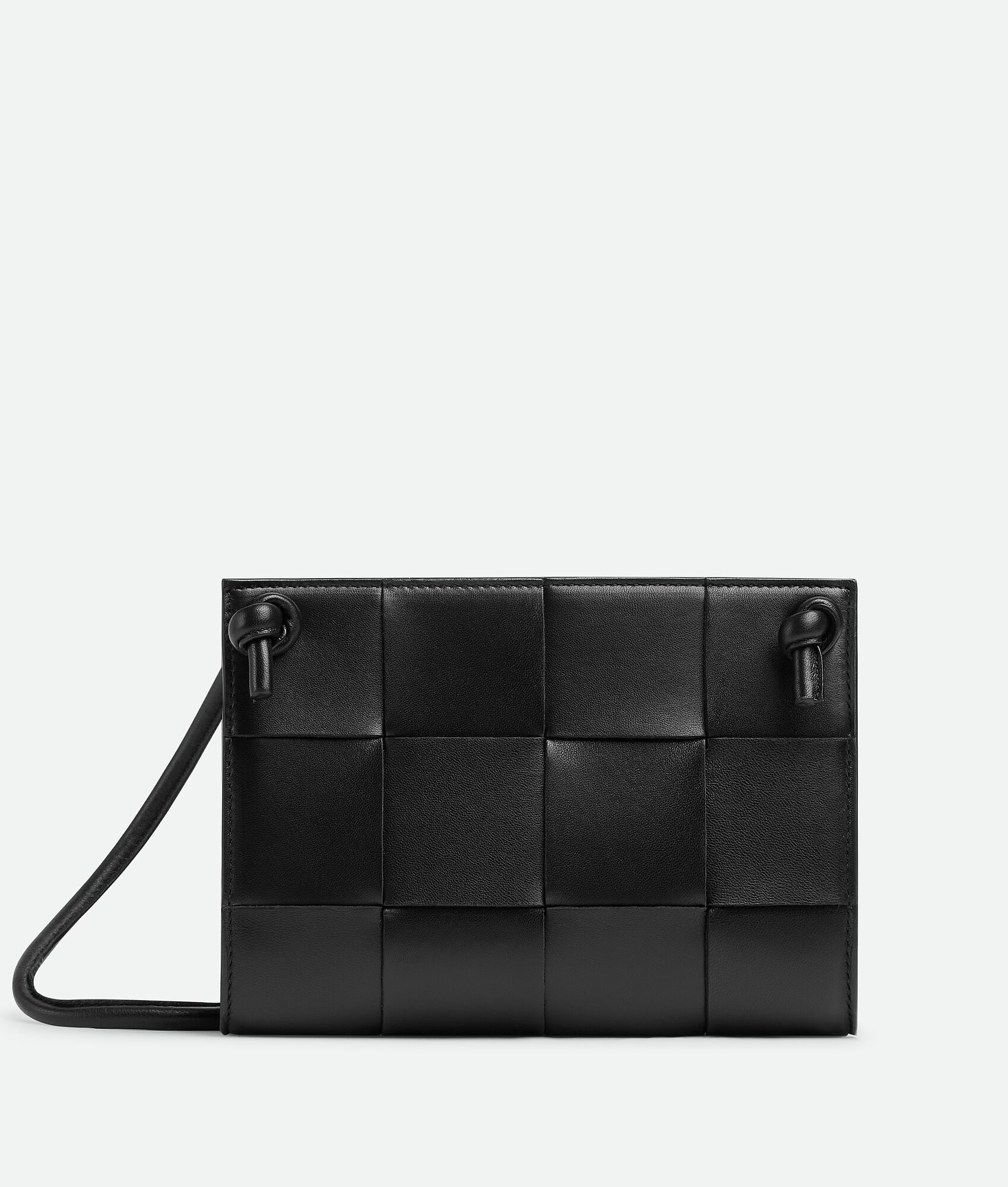 Mini Intreccio leather cross-body bag. Product details • Mini Intreccio leather cross-body bag • One main compartment • Tubular leather strap Material: 100% Lambskin • Lining: Calfskin • Color: Black • Hardware: Gold finish • Height: 15 cm | 5.9” • Width: 22 cm | 8.6" • Depth: 5.5 cm | 2.1" • Strap drop: 50 cm | 20" Made in: Italy