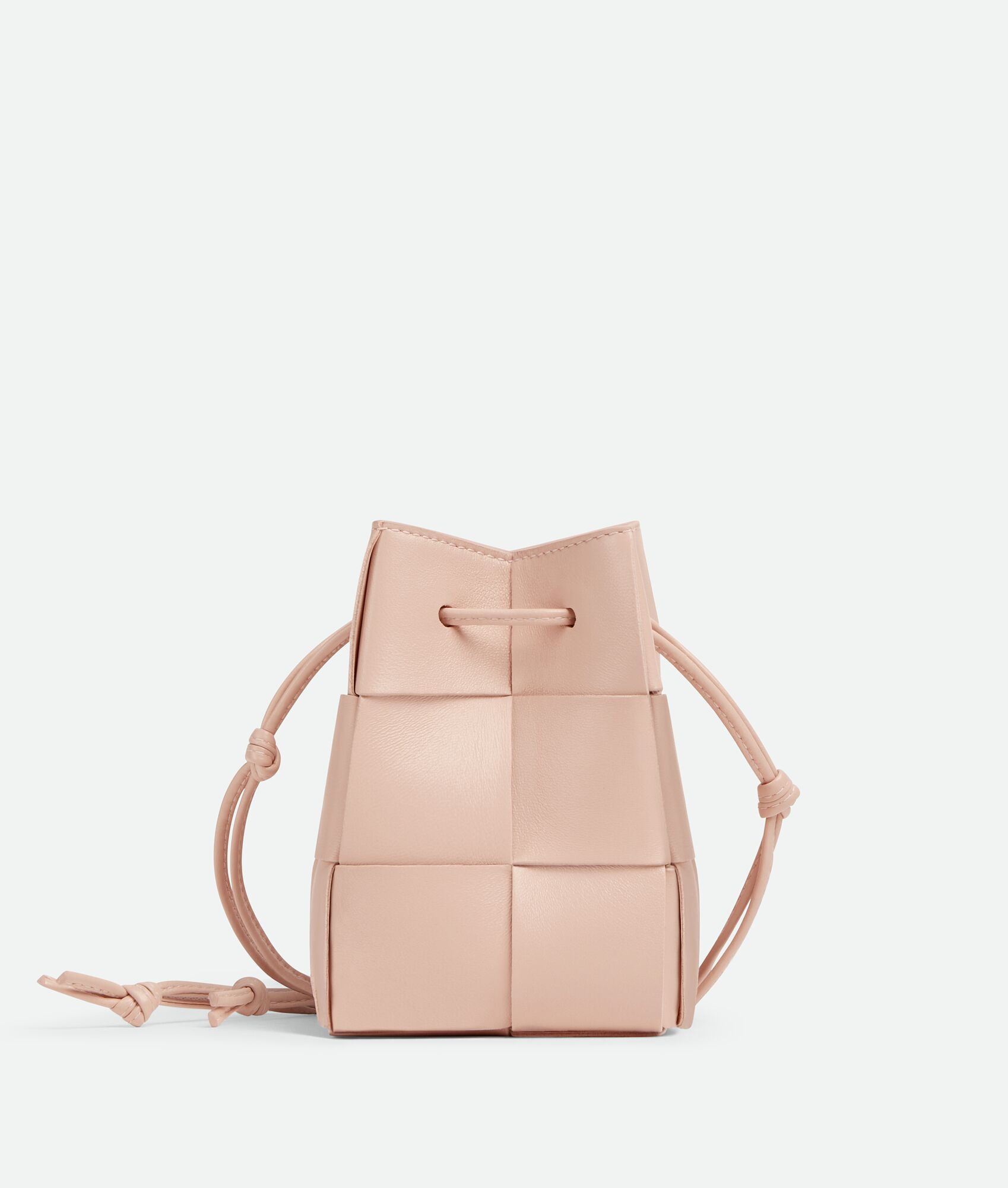 Cross-body bucket bag realised with Intreccio craftsmanship in soft lambskin leather. Product details • Mini Intreccio leather cross-body bucket bag • Single interior open pocket • Drawstring closure Material: 100% Lambskin • Lining: Calfskin bonded Intreccio • Color: Lotus • Hardware: Gold finish • Height: 14 cm | 5.5" • Width: 9 cm | 3.5" • Depth: 9 cm | 3.5" • Strap drop: 53 cm | 20.9" Made in: Italy Size & fit • Fits a credit card case, airpods, a lipstick and keys.