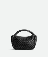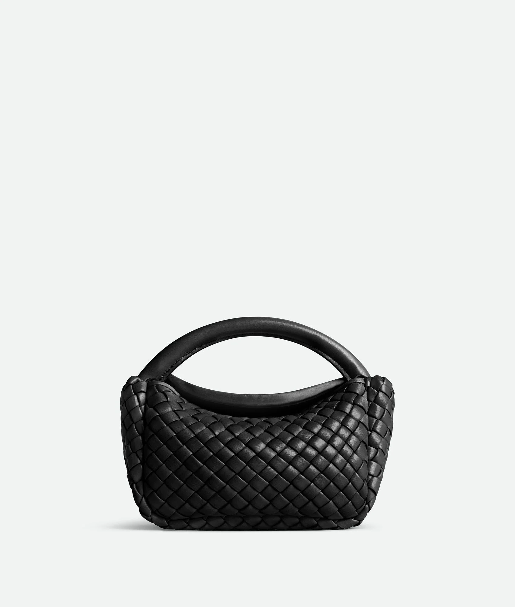 Top handle bag crafted in soft padded Intreccio leather with detachable strap. Product Details - Mini padded Intreccio leather top handle bag with detachable leather strap - Flap closure secured with magnet - Material: lambskin - Lining: Unlined - Color: Black - Hardware: Brass finish - Height: 11 cm | 4.3" - Width: 23 cm | 9.1" - Depth: 8 cm | 3.1" - Strap drop: 60 cm | 23.6” - Made in: Italy - Product code: 805739V3RG11019 Size & Fit - Fits iPhone 15 Pro Max, a credit card case, airpods and keys.