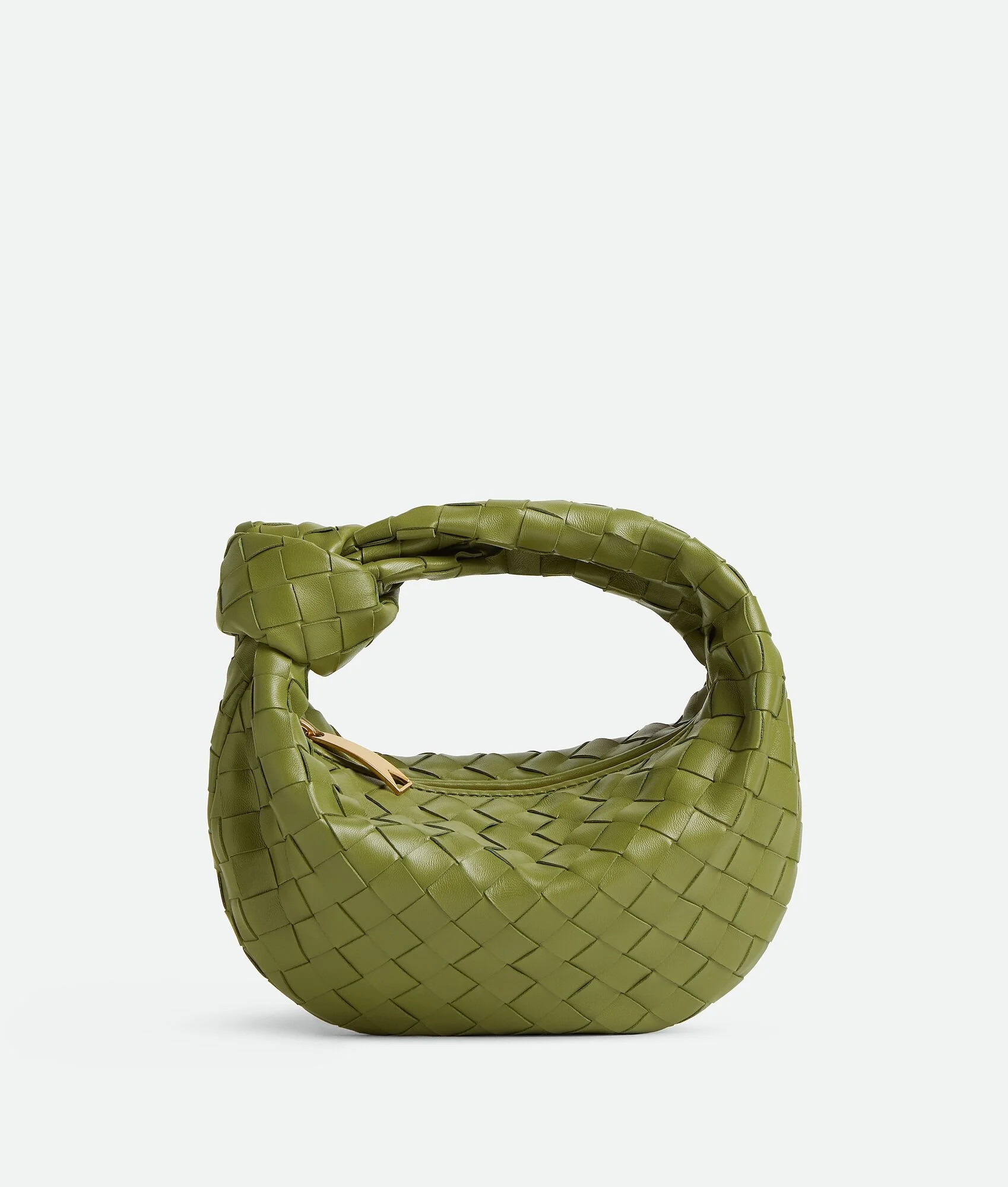 Top handle bag with rounded shape and signature knot in supple Intrecciato leather. Product Details - Mini Intrecciato leather top handle bag - Single compartment - Zip closure - Material: Lambskin - Lining: Calfskin - Color: Matcha - Hardware: Gold finish - Height: 10cm - Width: 28 cm | 11” - Depth: 8.5cm - Handle drop: 10cm - Made in: Italy - Product code: 651876VCPP52488 Size & Fit - Fits iPhone 16 Pro Max, a credit card case, airpods and keys.