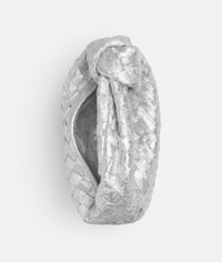 Product Details - Mini Intrecciato lamina satin leather top handle bag - Single compartment - Zip closure - Lining: Lambskin - Color: Silver - Hardware: Silver finish - Made in: Italy - Product code: 651876V5XF08101 Material - Material: Lambskin Size & Fit - Height: 10 cm (3.9") - Width: 28 cm (11.0") - Depth: 8.5 cm (3.3") - Handle drop: 10 cm (3.9")