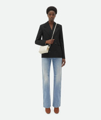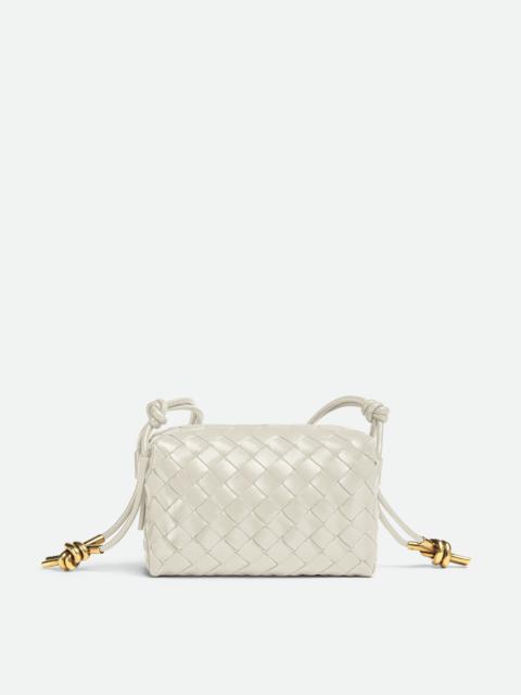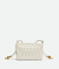 Mini intrecciato leather crossbody bag with knotted metallic embellishment. Product Details - Mini intrecciato leather crossbody bag with knotted metallic embellishment - Single compartment - Zip closure - Material: Calfskin - Lining: Calfskin - Color: Bone - Hardware: Muse Brass finish - Height: 11 cm | 4.3" - Width: 17 cm | 6.7" - Depth: 6 cm | 2.3 - Strap drop: 50 cm | 19.7" - Made in: Italy - Product code: 736125V2GV19233 Size & Fit - Fits iPhone 15 Pro Max, a credit card case, airpods and keys.