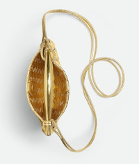 Cross-body bag realised with Intrecciato craftsmanship in mirror laminated lambskin Product details • Mini Intrecciato laminated leather cross-body bag with metallic top handle • Single compartment • Magnetic closure • The metallic handle is crafted by artisans and showcases nuances and engraved markings making each piece unique Material: 100% Lambskin • Lining: Lambskin bonded Intrecciato • Color: Gold • Hardware: Brass finish • Height: 12 cm | 4.7" • Width: 20 cm | 7.9" • Depth: 2.5 cm | 1" • Handle drop: 5 cm | 2" • Strap drop: 60 cm | 23.6" Made in: Italy Size & fit • Fits iPhone 15 Pro Max.