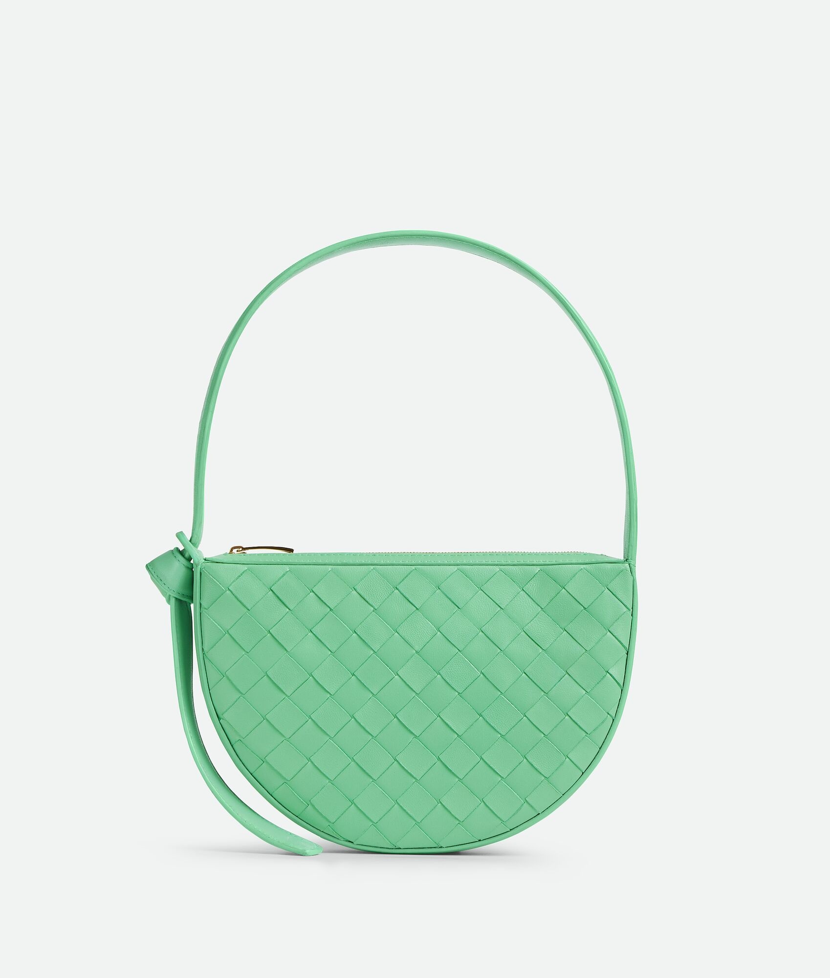 Shoulder bag realised with Intrecciato craftsmanship in soft lambskin leather with Product details • Mini Intrecciato leather shoulder bag with knot • One main compartment • Internal flat pocket • Zippered closure Material: 100% Lambskin • Lining: Calfskin • Color: Siren • Hardware: Gold finish • Height: 15 cm | 5.9" • Width: 23 cm | 9.1" • Depth: 4 cm | 1.6 • Strap drop: 20 cm | 7.9" Made in: Italy