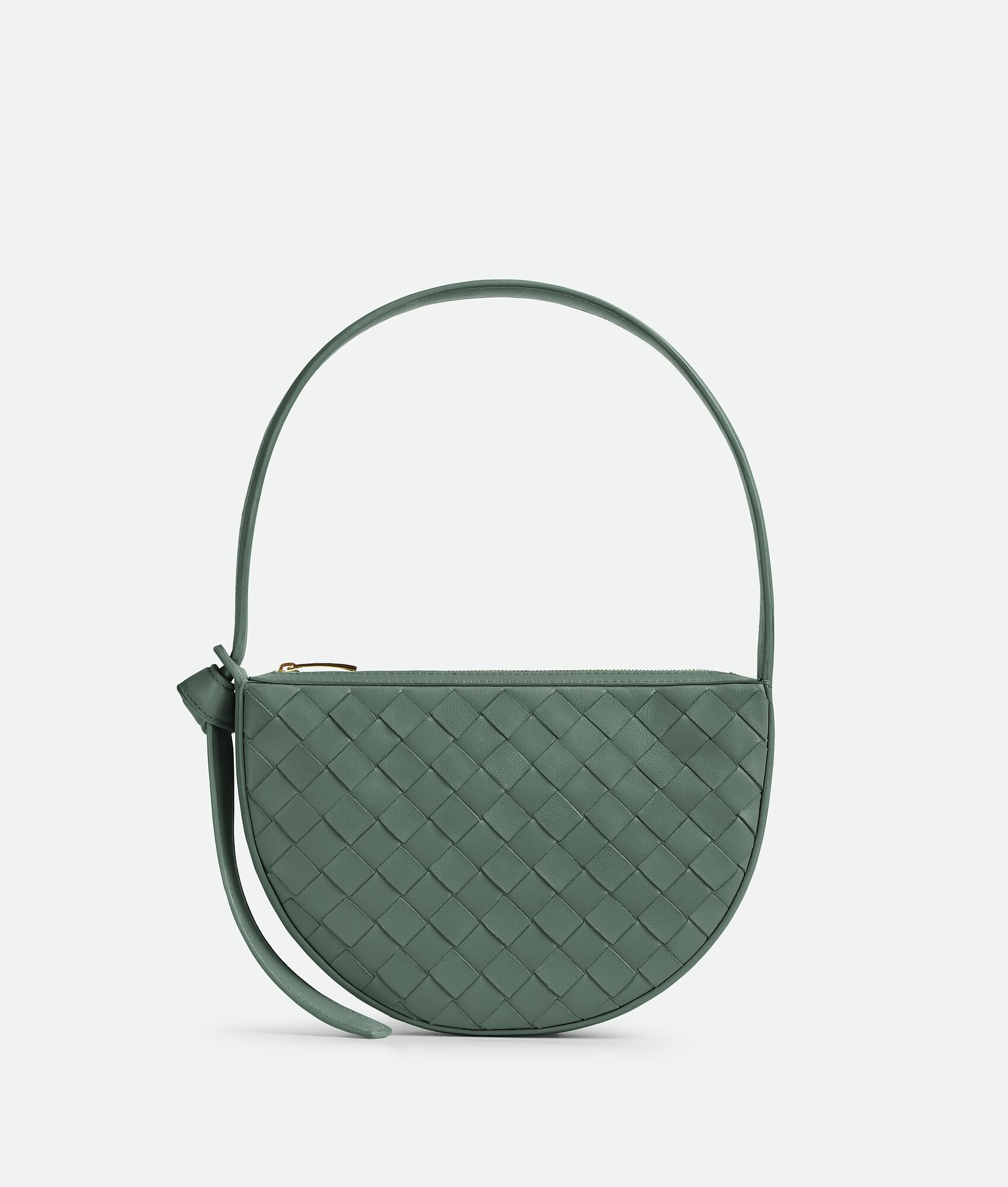 Shoulder bag realised with Intrecciato craftsmanship in soft lambskin leather with Product Details - Mini Intrecciato leather shoulder bag with knot - One main compartment - Internal flat pocket - Zippered closure - Material: Lambskin - Lining: Calfskin - Color: Aloe - Hardware: Gold finish - Height: 15 cm | 5.9" - Width: 23 cm | 9.1" - Depth: 4 cm | 1.6" - Strap drop: 20 cm | 7.9" - Made in: Italy - Product code: 763747VCPP33198 Size & Fit - Fits iPhone 15 Pro Max, a credit card case, airpods and keys.