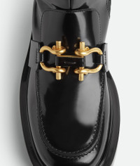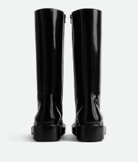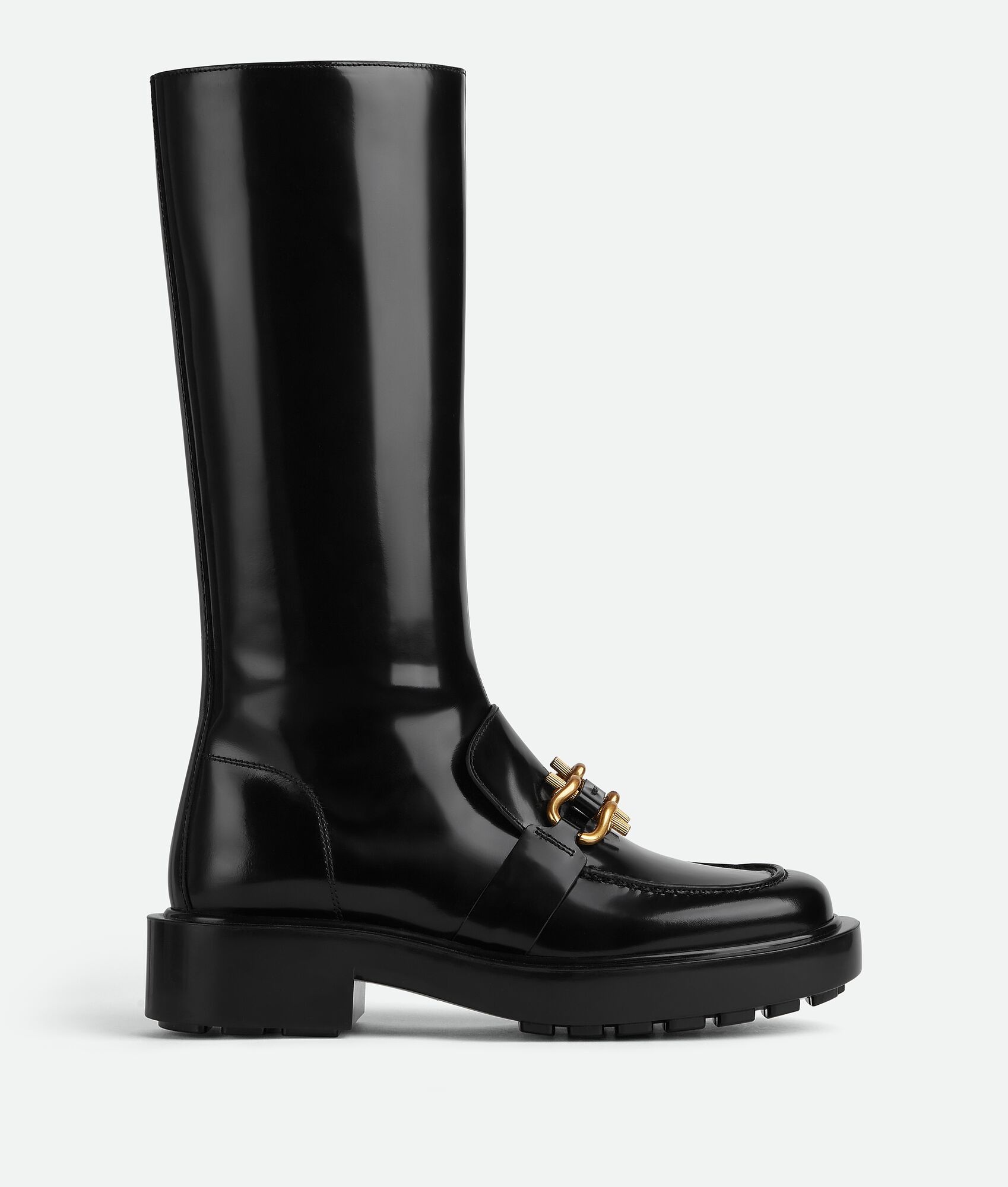 Chunky knee-high boot with gold-finished metallic horse bit. Realised in glossy calfskin. Product details • Glossy leather chunky knee-high boot Material: 100% Calfskin • Lining: Goatskin • Color: Black • Hardware: Gold finish • Chunky lugged rubber outsole • Flatform: 6 cm | 2.4" Made in: Italy