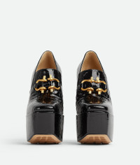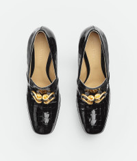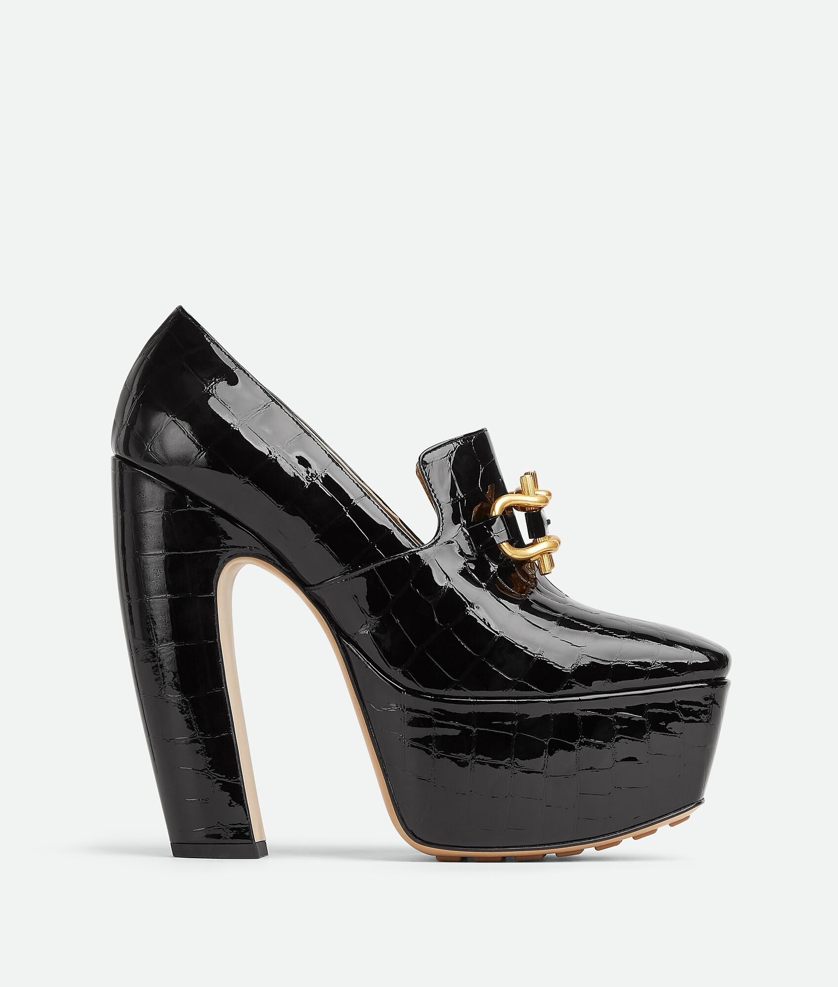 • Croc-embossed glossy leather pumps Material: 100% Calfskin • Lining: Lambskin • Color: Black • Hardware: Gold finish • Bio-based rubber-injected and biodegradable leather outsole • Heel: 14.5 cm | 5.7" • Platform: 5.5 cm | 2.2" Made in: Italy