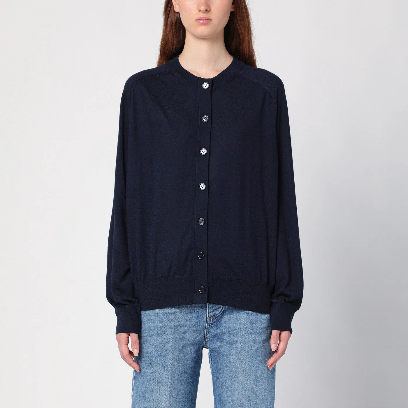 Navy blue cashmere crew-neck cardigan by Bottega Veneta features long sleeves a front button placket and ribbed hems.