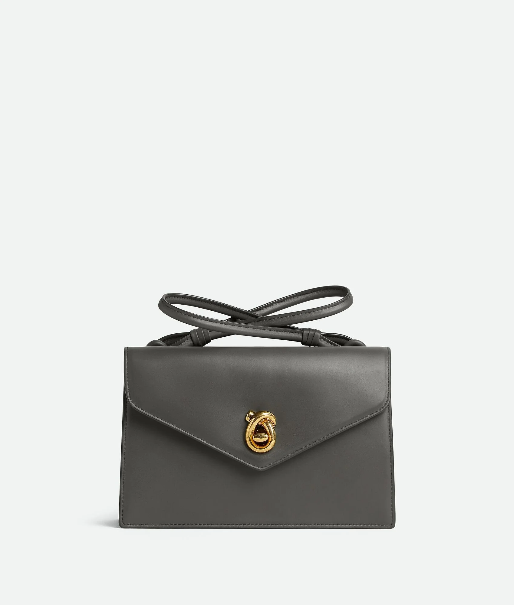Shoulder bag in smooth calf leather with sculptural knot closure and interlaced top Product Details - Calf leather shoulder bag with interlaced top handle - One main compartment - Single interior zipped pocket - Back flap pocket - Metallic knot lock closure - Material: Calfskin - Lining: Lambskin - Color: Lapilli - Hardware: Brass finish - Height: 15 cm | 5.9" - Width: 23.5 cm | 9.3" - Depth: 7.5 cm | 3" - Strap drop: 14 cm | 5.5" - Made in: Italy - Product code: 836301V4SJ01317 Size & Fit - Fits iPhone 16 Pro Max, a credit card case, airpods and keys.