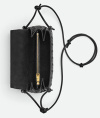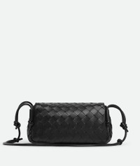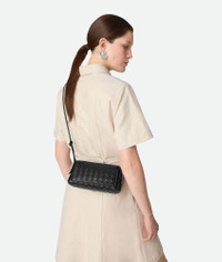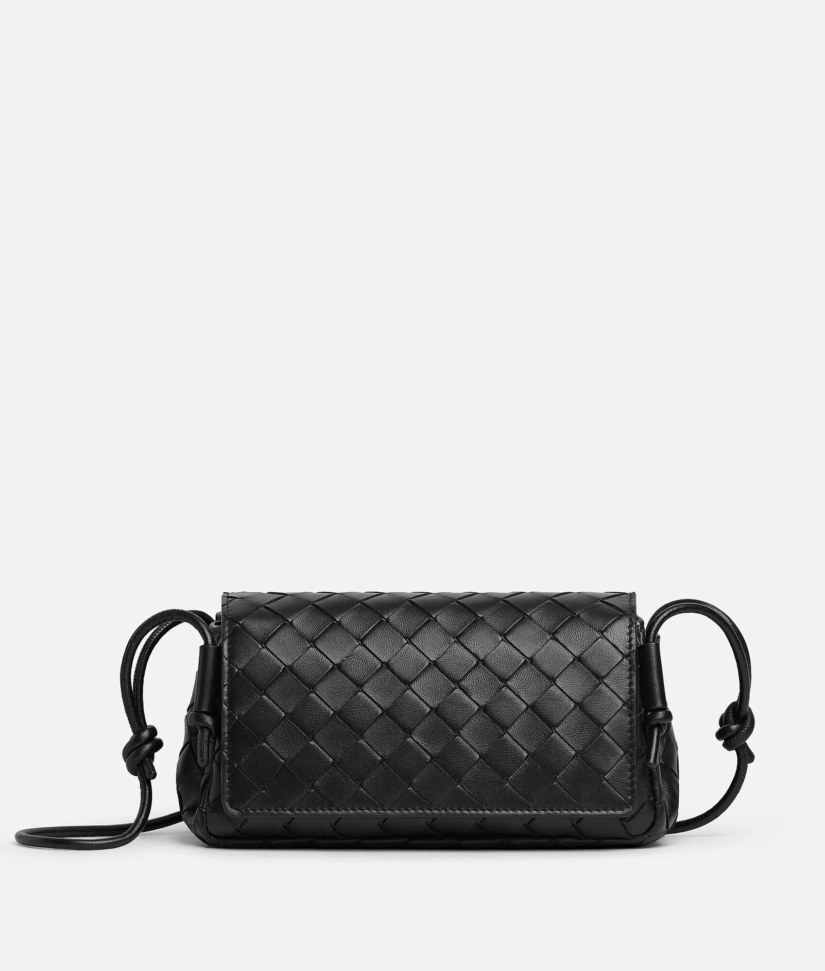 Product Details - Intrecciato nappa leather pouch - Two main compartments, one interior zipper pocket - Flap closure with magnets - Adjustable leather tubular strap with sliding knots - Lining: Suede - Color: Black - Hardware: Gold finish - Made in: Italy - Product code: 843893VCPP08425 Material - Material: Lambskin Size & Fit - Fits iPhone 16 Pro Max, a credit card case, airpods and keys.
