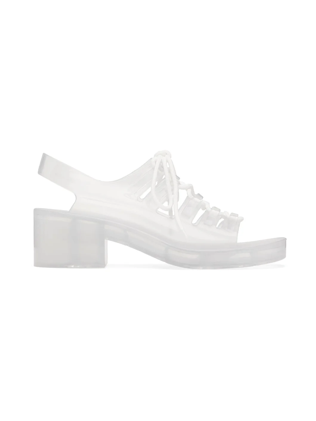 Transparent rubber heeled sandals in off-white. · Open round toe · Lace-up closure · Cutouts at vamp · Block heel · Rubber sole · Heel: H2.25 in Supplier color: Glass Rubber. Made in Italy 231798F125030