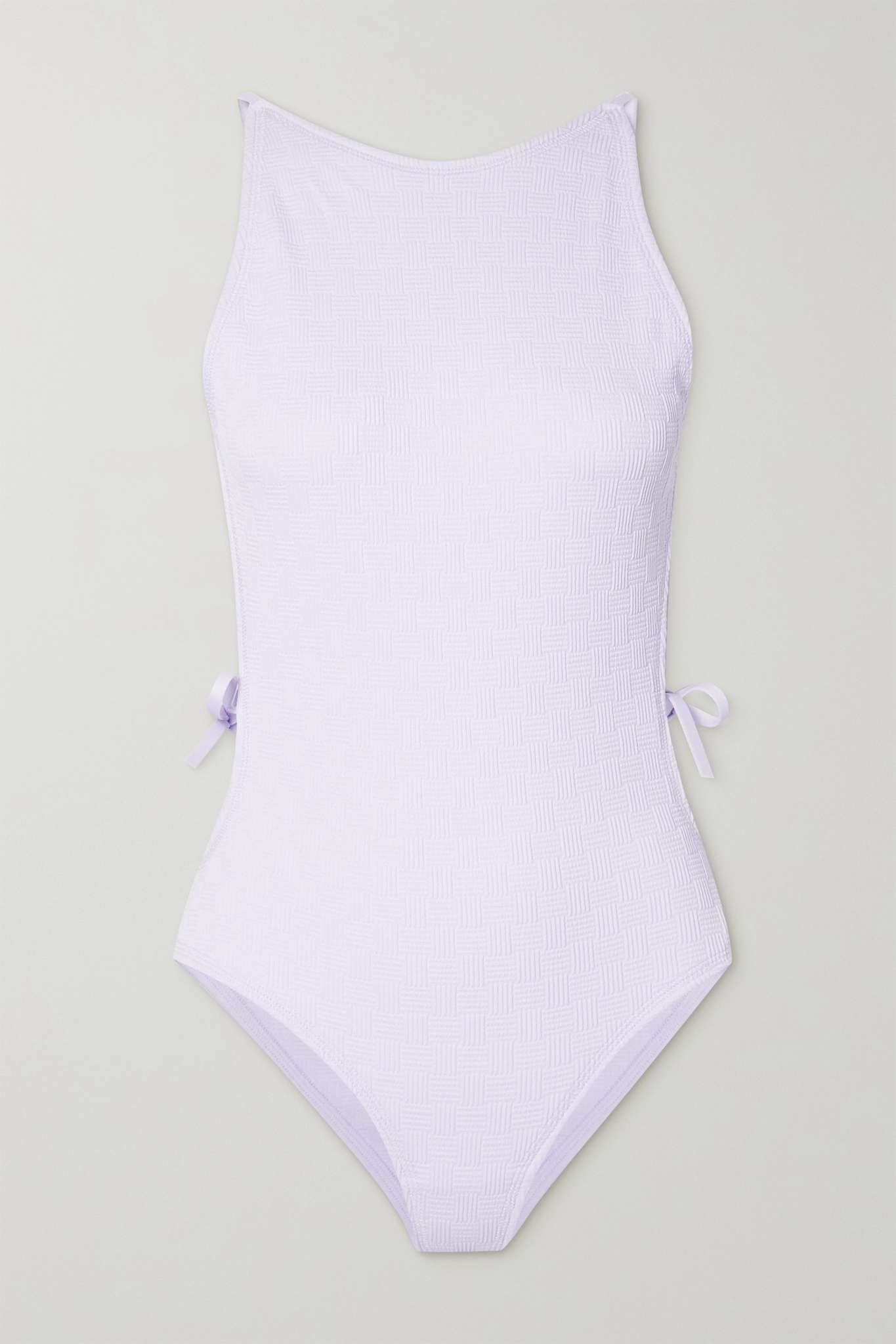 EDITORS'NOTES Bottega Veneta's swimsuit is an investment piece thanks to its classic shape. It's made from flexible seersucker that nods to the brand's iconic intrecciato weave and has an open back. Complement the lilac hue with gold or silver sunglasses. SIZE & FIT - Fits true to size, take your normal size - Medium brief coverage - Model is 175cm/ 5'9", bra size 30C and is wearing a size XSmall DETAILS & CARE - Lilac seersucker - Pulls on - 97% polyamide, 3% elastane - Hand wash - Designer color: Mirth Washed - Lotion, sunscreen, oil and chlorine can cause discoloration of this item; this is not a manufacturing defect. Please follow care instructions to keep your swimwear in the best condition