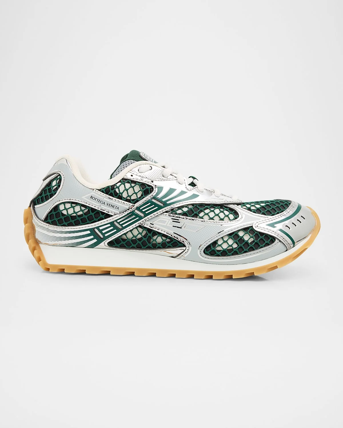 Bottega Veneta "Orbit" faux leather (polyurethane) and lightweight technical mesh runner sneakers Flat heel Round toe Laceup vamp Cushioned footbed Rubber outsole Sizing: size up recommended Made in Italy