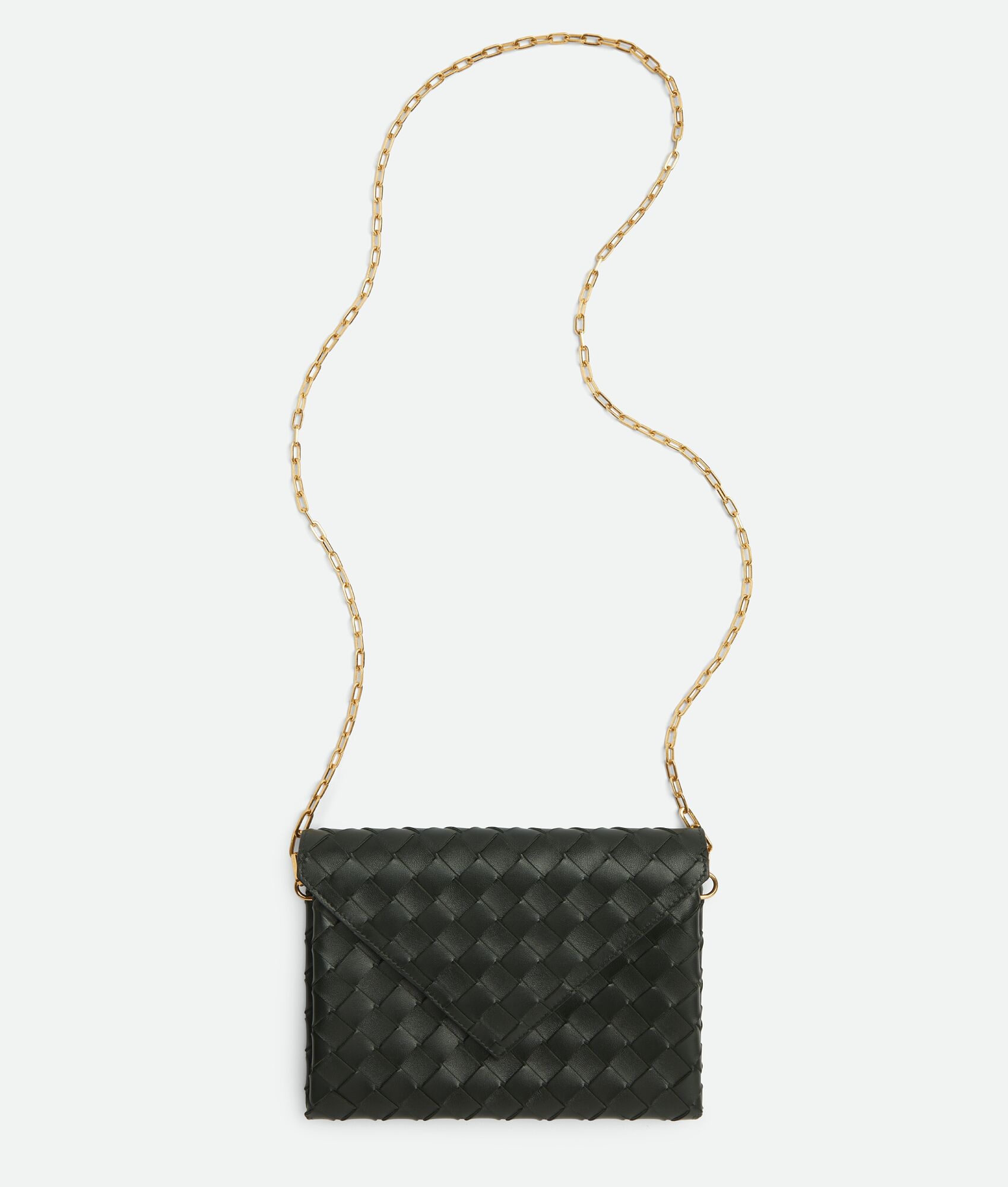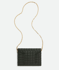 Medium Intreccio leather envelope pouch with detachable chain. Product details • Medium Intreccio leather envelope pouch with detachable chain • One main compartment • Magnetic closure Material: 100% Lambskin • Lining: Bonded calfskin • Color: Dark Green • Hardware: Gold finish • Height: 15.3 cm | 6" • Width: 21 cm | 8.3" • Depth: 1 cm | 0.4" Made in: Italy