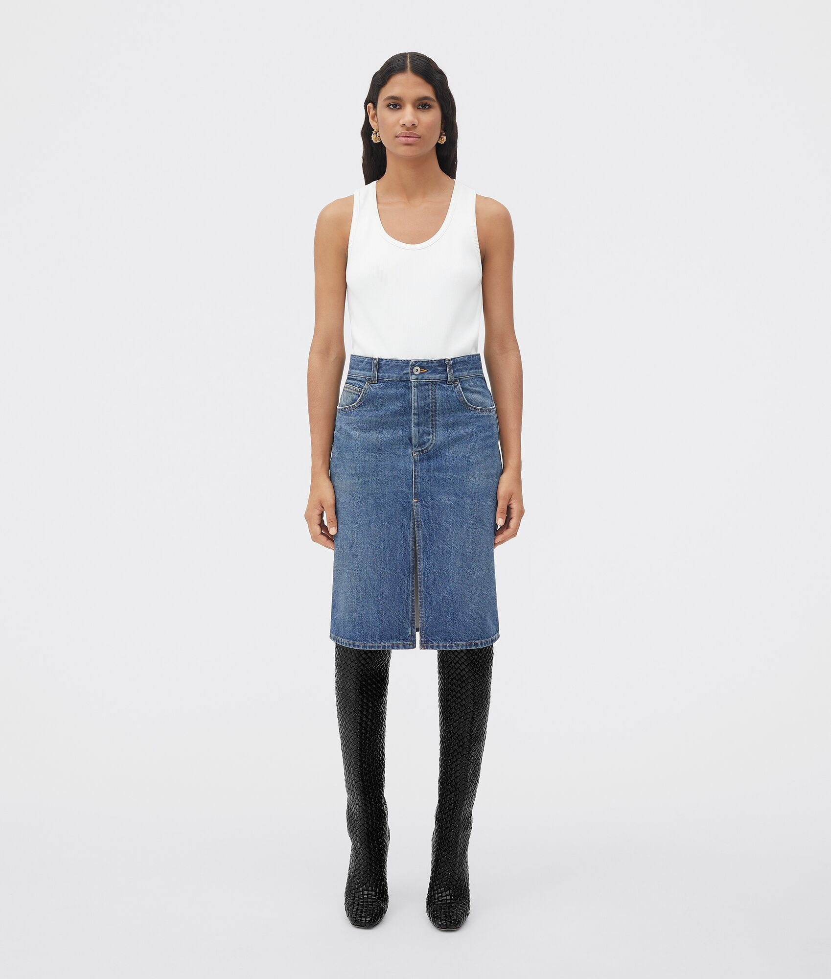 Medium washed denim skirt. Product details • Medium washed denim skirt • Parakeet leather tab • Button closure Material: 100% Cotton • Color: Original Medium Wash Indigo Made in: Italy Size & fit • Model is 176 cm | 5'9" and is wearing a Bottega Veneta size 38