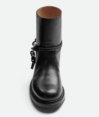 Ankle boot in calfskin leather with coaxial detailing and signature metal triangle. Product Details - Leather ankle boot - Coaxial detailing with signature metallic triangle element - Lining: Calf leather - Color: Black - Hardware: Silver finish - Leather outsole with Goodyear construction - Made in: Italy - Product code: 843951V60E01000 Material - Material: Calfskin, lambskin