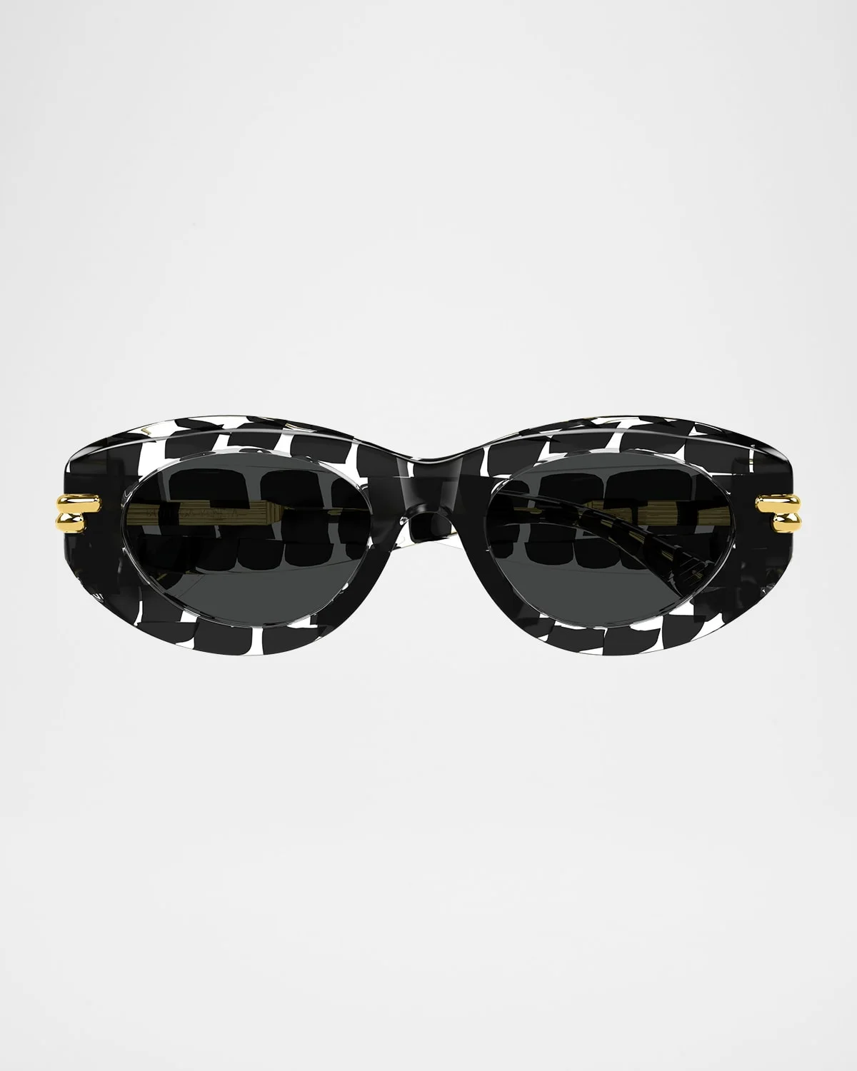 Crafted of tortoiseeffect acetate, these Bottega Veneta oval sunglasses offer a bold finish to any ensemble Eye/bridge/temple (in mm): 5516145 Monochromatic lenses Saddle nose bridge Signature ribbon motif at temples Thick, tapered arms Acetate 100% UVA/UVB protection Made in Italy