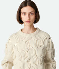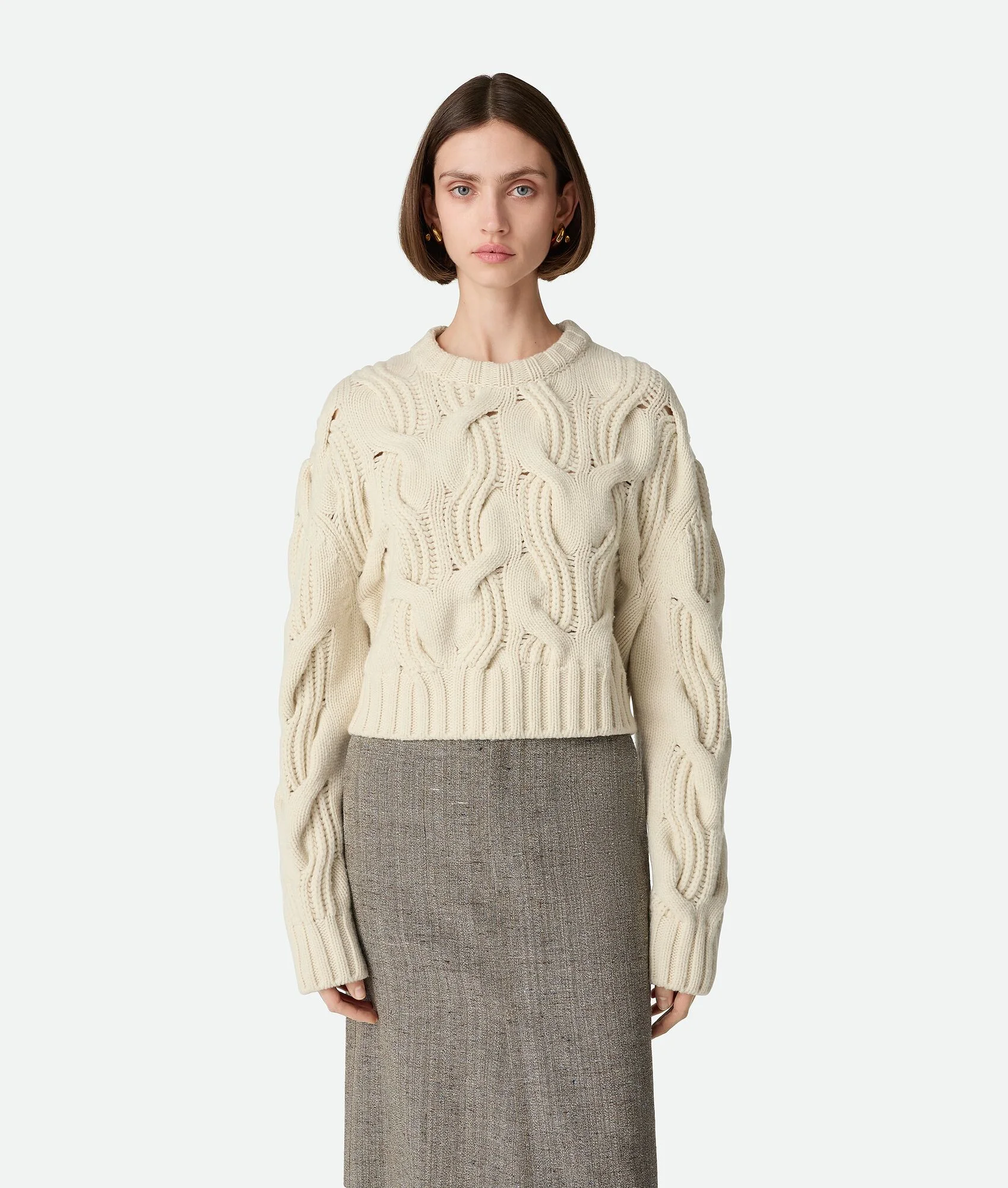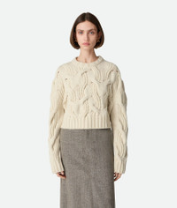 Cropped jumper in 3D twisted cable wool. Product Details - Twisted cable wool cropped sweater - Regular fit - Color: String - Made in: Italy - Product code: 833851V5LO02945 Material - Material: 100% Virgin wool Size & Fit - Model is 175 cm | 5'10" and is wearing a Bottega Veneta size S