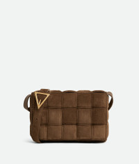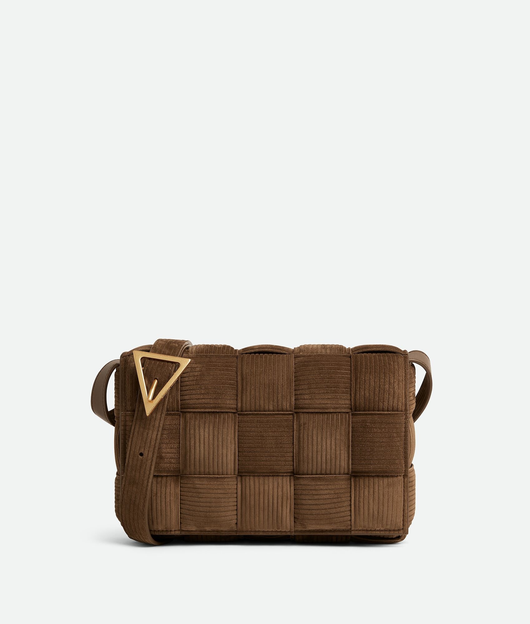Cross-body bag made from embossed-effect suede reminiscent of corduroy using padded Product details • Padded Intreccio corduroy suede cross-body bag • Single interior zip pocket • Metal closure Material: 100% Calfskin • Lining: Lambskin bonded Intreccio • Color: Jacobean • Hardware: Gold finish • Height: 18 cm | 7.1" • Width: 26 cm | 10.2" • Depth: 8 cm | 3.15" • Strap drop: 50 cm | 20" Made in: Italy
