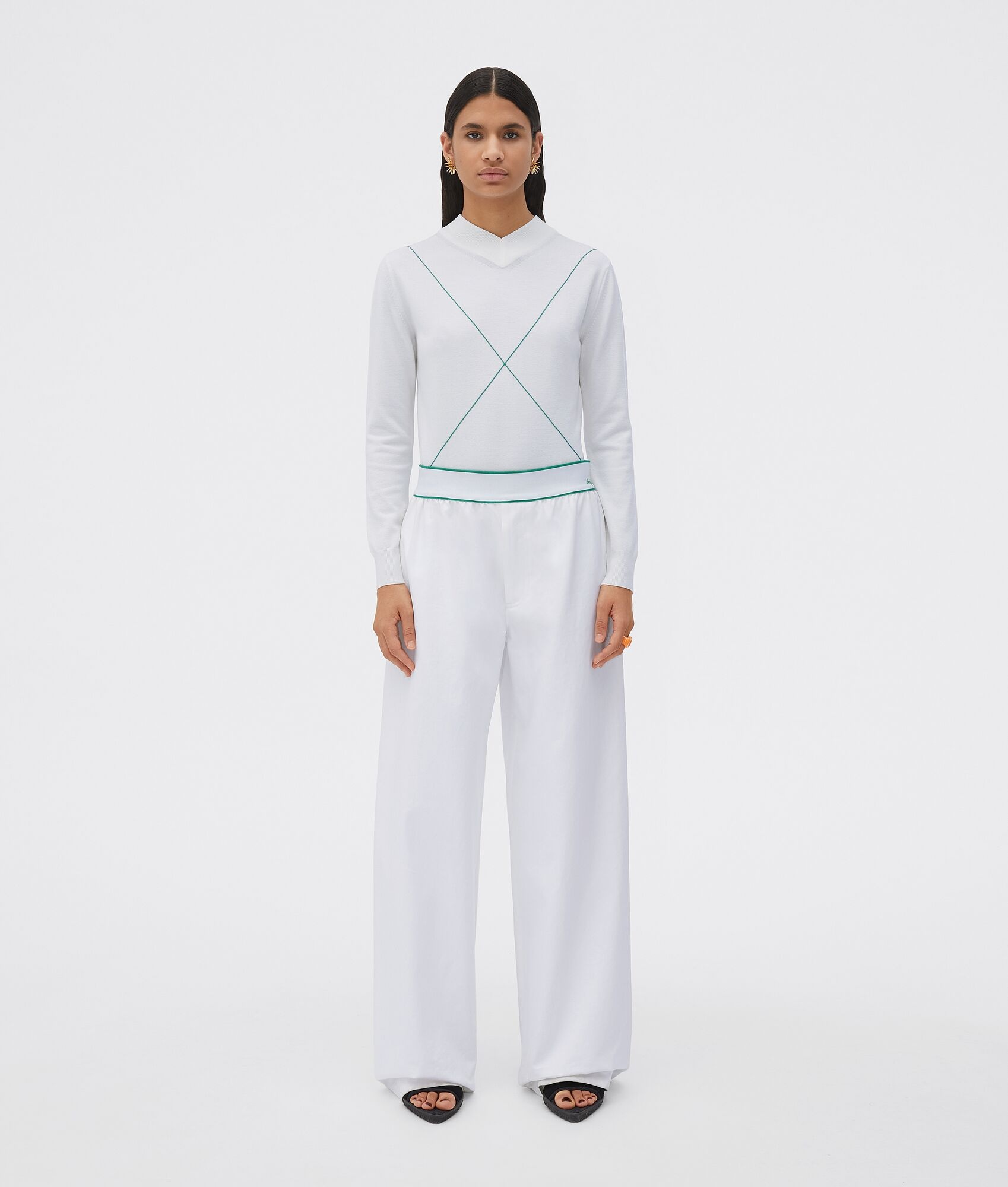 • Sanded cotton twill wide leg pants • Elasticated waistband with reverse embroidered logo Material: 100% Cotton • Color: White Made in: italy