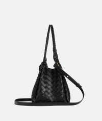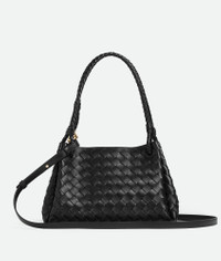 Shoulder bag in supple Intrecciato leather with signature knot detail and detachable Product Details - Intrecciato leather shoulder bag with detachable cross-body strap - One main compartment - Magnetic tab closure - Material: Lambskin - Lining: Lambskin bonded Intrecciato - Color: Black - Hardware: Brass finish - Height: 18.5 cm | 7.3" - Width: 29.5 cm | 11.6" - Depth: 17.5 cm | 6.9" - Handle drop: 22 cm | 8.7" - Made in: Italy - Product code: 835921VCPPT1019