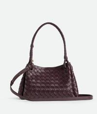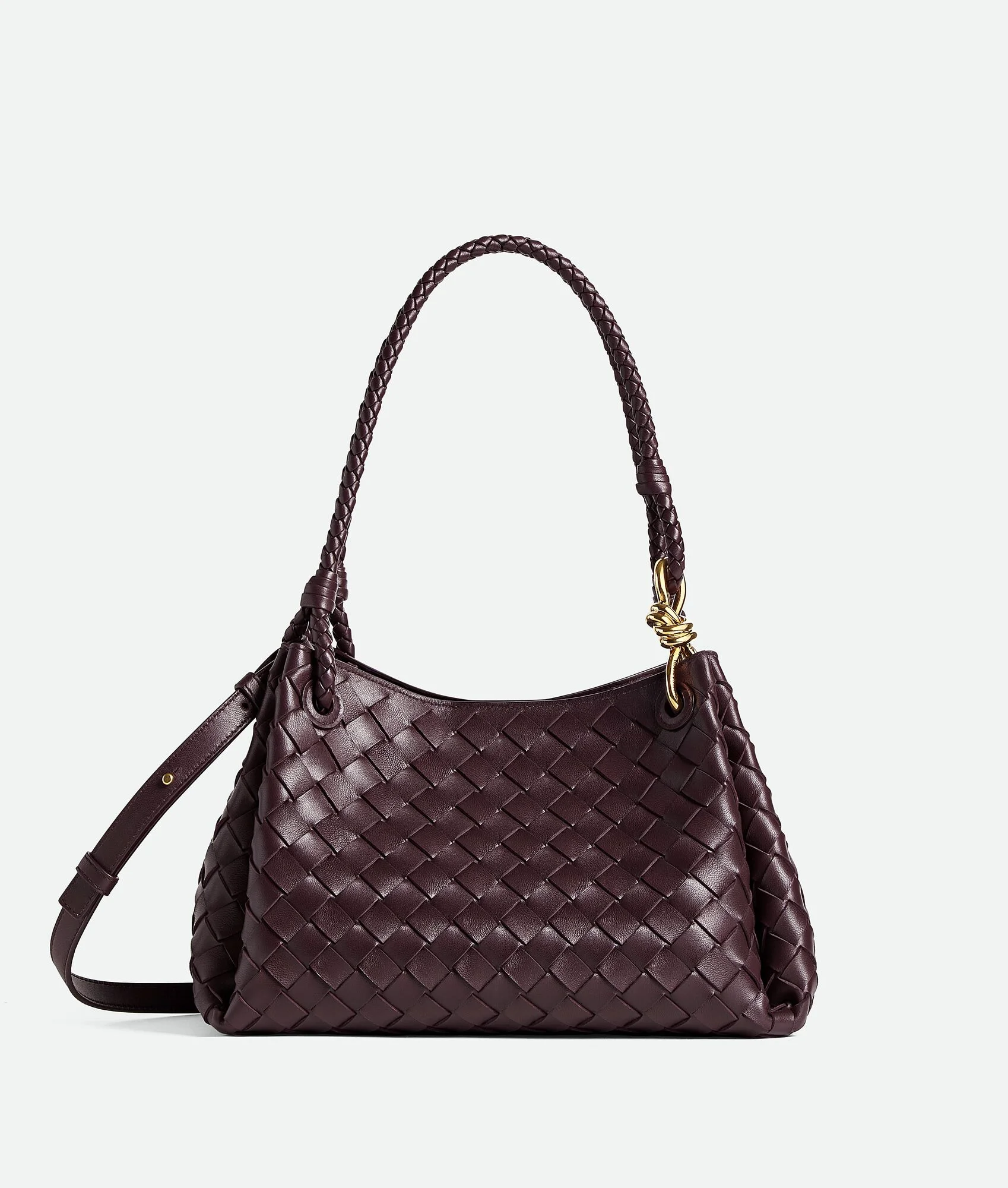 Product Details - Intrecciato leather shoulder bag with detachable cross-body strap - One main compartment - Magnetic tab closure - Lining: Lambskin bonded Intrecciato - Color: Dark Barolo - Hardware: Brass finish - Made in: Italy - Product code: 835921VCPPT2264 Material - Material: Lambskin Size & Fit - Height: 18.5 cm | 7.3" - Width: 29.5 cm | 11.6" - Depth: 17.5 cm | 6.9" - Handle drop: 22 cm | 8.7" - Strap drop: 59 cm | 23.2"