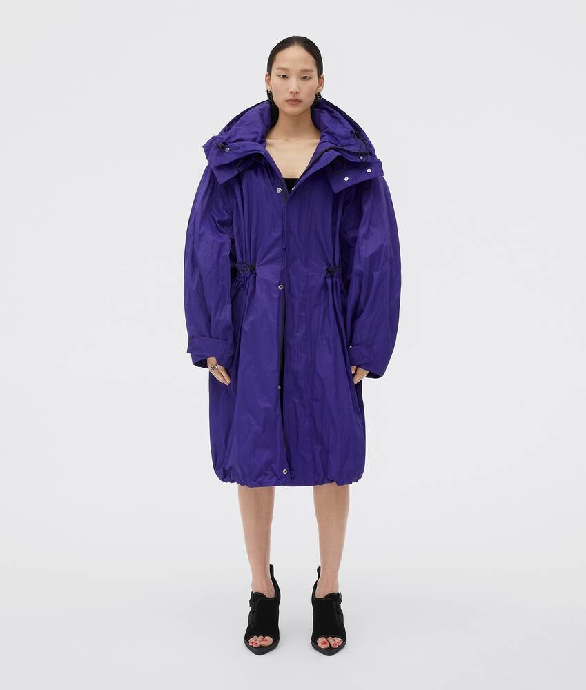 • Resinated metal twill parka • Concealed zip and button closure • Unlined • Oversized fit Material: 56% Polyamide, 34% Cotton, 10% Metallic Fiber • Color: Unicorn Made in: italy
