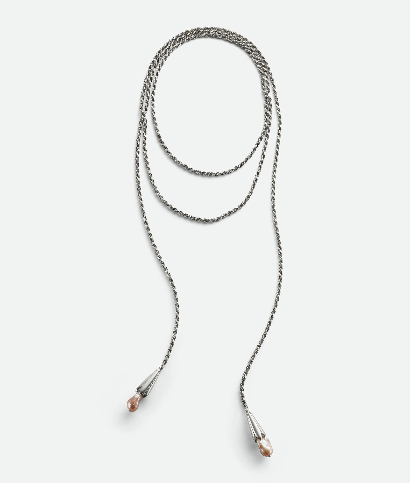 Necklace with scarf chain design and natural Baroque pearls realised in sterling Product Details - Sterling silver scarf necklace with natural pink freshwater pearl - No closure - Length: 180 cm | 70.9” - Material: Sterling silver, pearl - Color: Natural Pink - Made in: Italy - Product code: 814911V721C6307
