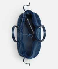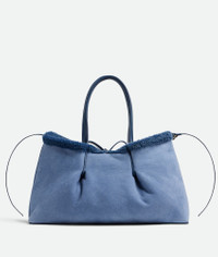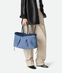 Reversible tote bag in merino shearling with denim effect. Product Details - Merino shearling reversible tote bag with denim effect - Single detachable interior zipped pocket - Leather tie closure - Lining: Suede - Color: Ocean/Pacific - Hardware: Brass finish - Made in: Italy - Product code: 844081V5Y914314 Material - Material: Sheepskin, calfskin Size & Fit - Height: 26 cm | 10.2" - Width: 42 cm | 16.5" - Depth: 16 cm | 6.3" - Handle drop: 21 cm | 8.3"