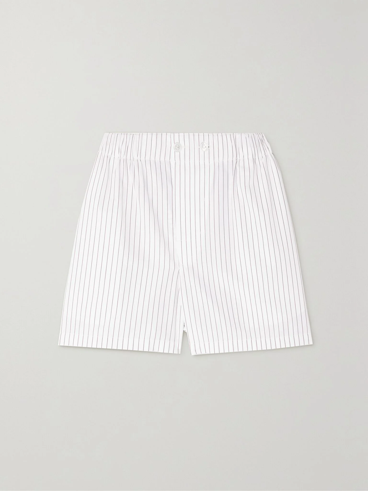 For Fall '23, Bottega Veneta's Matthieu Blazy is inspired by the street style of ordinary people - it's why the collection has no clear theme and instead celebrates the singularity of each look. These shorts are cut from pinstriped cotton-poplin and have a comfortable elasticated waistband. Style yours with a relaxed tee or the matching shirt, just like it was on the runway. Details & Care - White and brown cotton-poplin - Button fastenings at front - 100% cotton