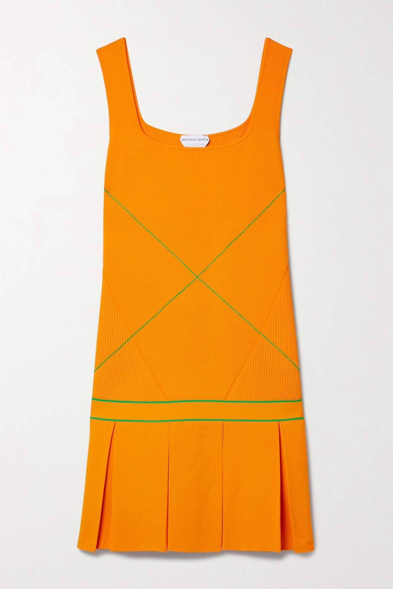 EDITORS'NOTES If Bottega Veneta's orange mini dress reminds you of tennis styles, it's because the collection is packed with sportswear references. Knitted for a relaxed fit, it's traced with contrasting green lines and has a pleated hem. SIZE & FIT - Fits true to size, take your normal size - Designed for a relaxed fit - Mid-weight knit - Model is 180cm/ 5’11” and is wearing a size Small DETAILS & CARE - Orange and green viscose-blend - Slips on - 83% viscose, 17% polyester - Dry clean