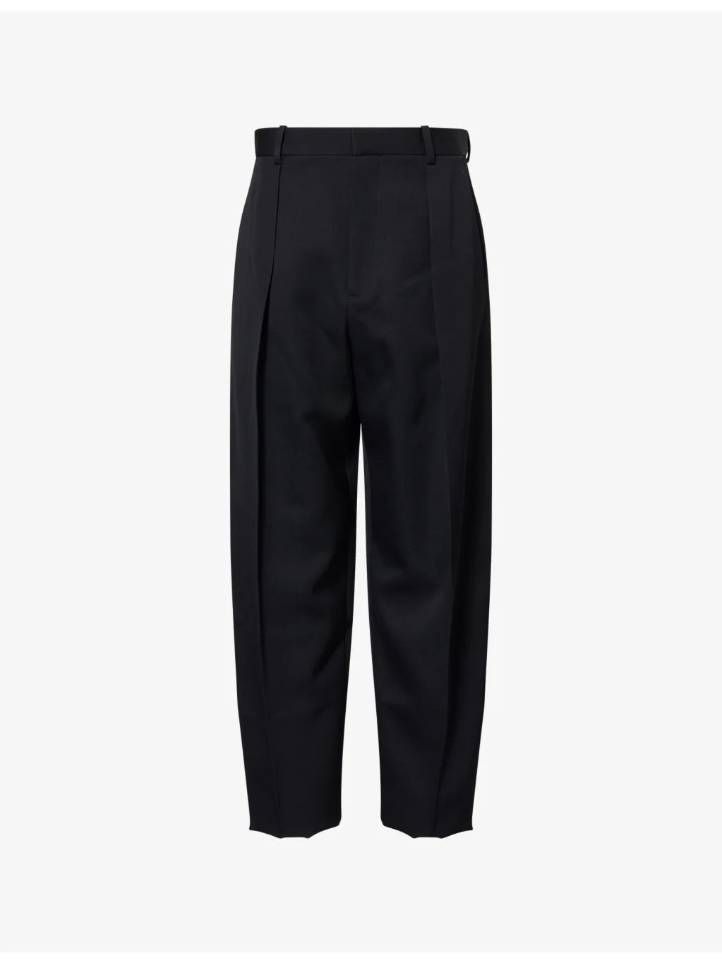 PRODUCT DETAILS - Bottega Veneta wool trousers - 100% wool; lining 100% cotton - Concealed button, hook-and-eye and zip-fly fastening at front - Relaxed fit, high-rise, wide leg, belt loops, two slip pockets and pleated at front, welt and buttoned pockets at back - Unfinished hems, ready for tailoring - Dry clean - Made in Italy - True to size - Size UK 8: rise 15in / 38cm, inside leg 32in / 82cm, leg opening 16in / 41cm - Model is 5ft 10in/1.78m and wears a size UK 8 - Lightweight, slight stretch - Please note that altered garments cannot be returned in store or online. Ref: R04462014