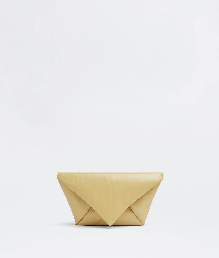 ▪ Medium leather pouch ▪ One compartment ▪ Magnetic closure Material: 100% Calfskin Lining: Calfskin Color: Tapioca Hardware: Gold finish Height: 13 cm Width: 27 cm Depth: 1 cm Made in: italy