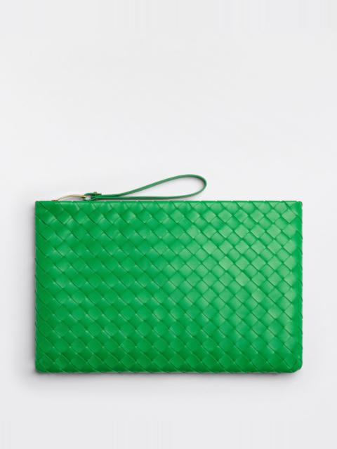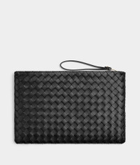 Large intrecciato leather pouch. Product Details - Large intrecciato leather pouch - Single compartment - Zip closure with detachable wristlet - Material: lambskin - Lining: Cotton - Color: Black - Hardware: Gold finish - Height: 24 cm | 9.4 " - Width: 36 cm | 14.2 " - Depth: 2 cm | 0.8 " - Strap drop: 18 cm | 7.1 " - Made in: Italy - Product code: 608249VCPP18425