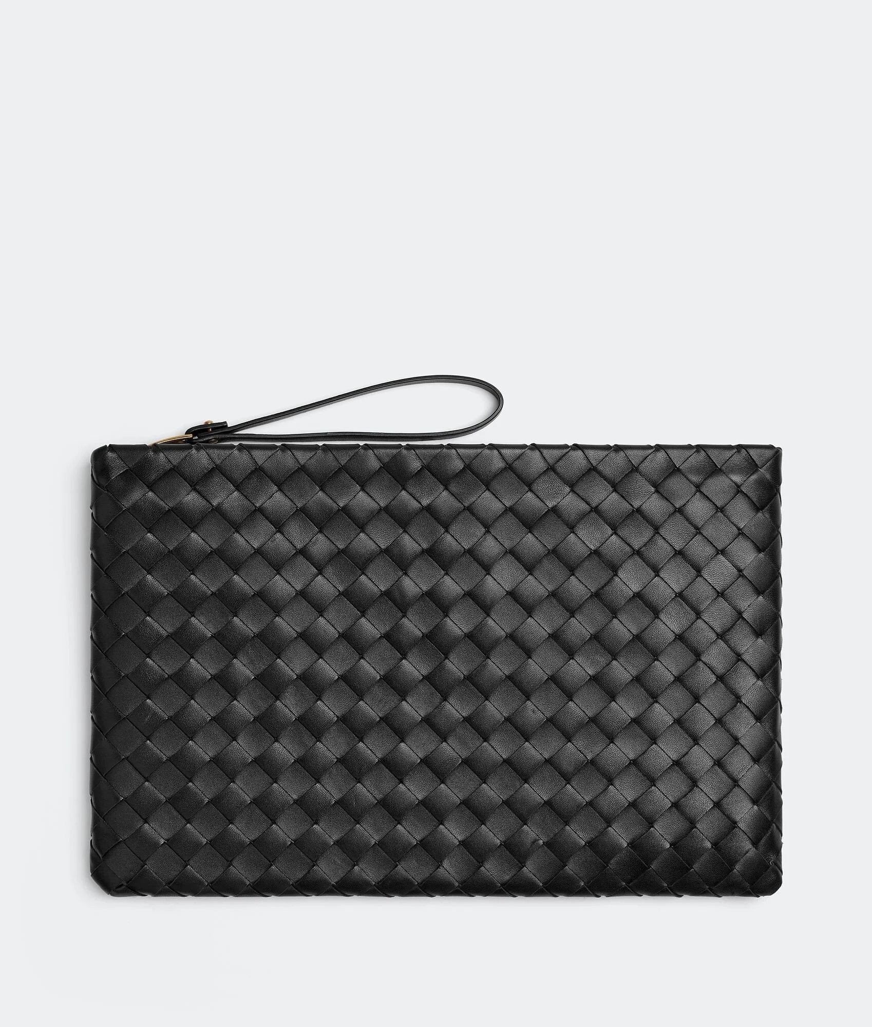Large intrecciato leather pouch. Product Details - Large intrecciato leather pouch - Single compartment - Zip closure with detachable wristlet - Material: 100% Lambskin - Lining: Cotton - Color: Black - Hardware: Gold finish - Height: 24 cm | 9.4 " - Width: 36 cm | 14.2 " - Depth: 2 cm | 0.8 " - Strap drop: 18 cm | 7.1 " - Made in: Italy - Product code: 608249VCPPA8425