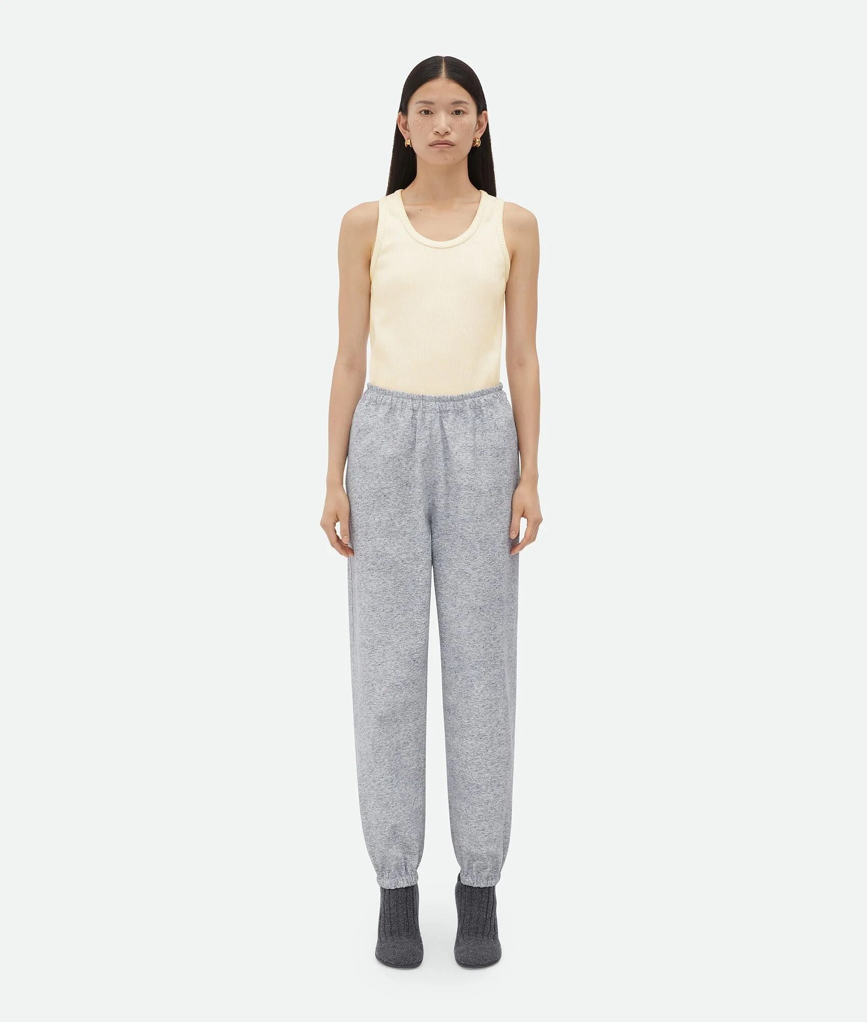 Jogger trousers meticulously realised from a signature printed leather technique Product details • Printed jersey jogger trousers • Elasticated waistband • Half lined in cotton • Relaxed fit Material: 100% Calfskin • Color: Light Grey Melange Made in: Italy Size & fit • Model is 180 cm | 5'11" and is wearing a Bottega Veneta size S