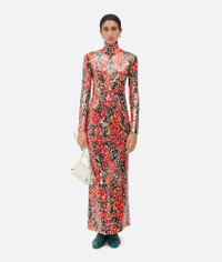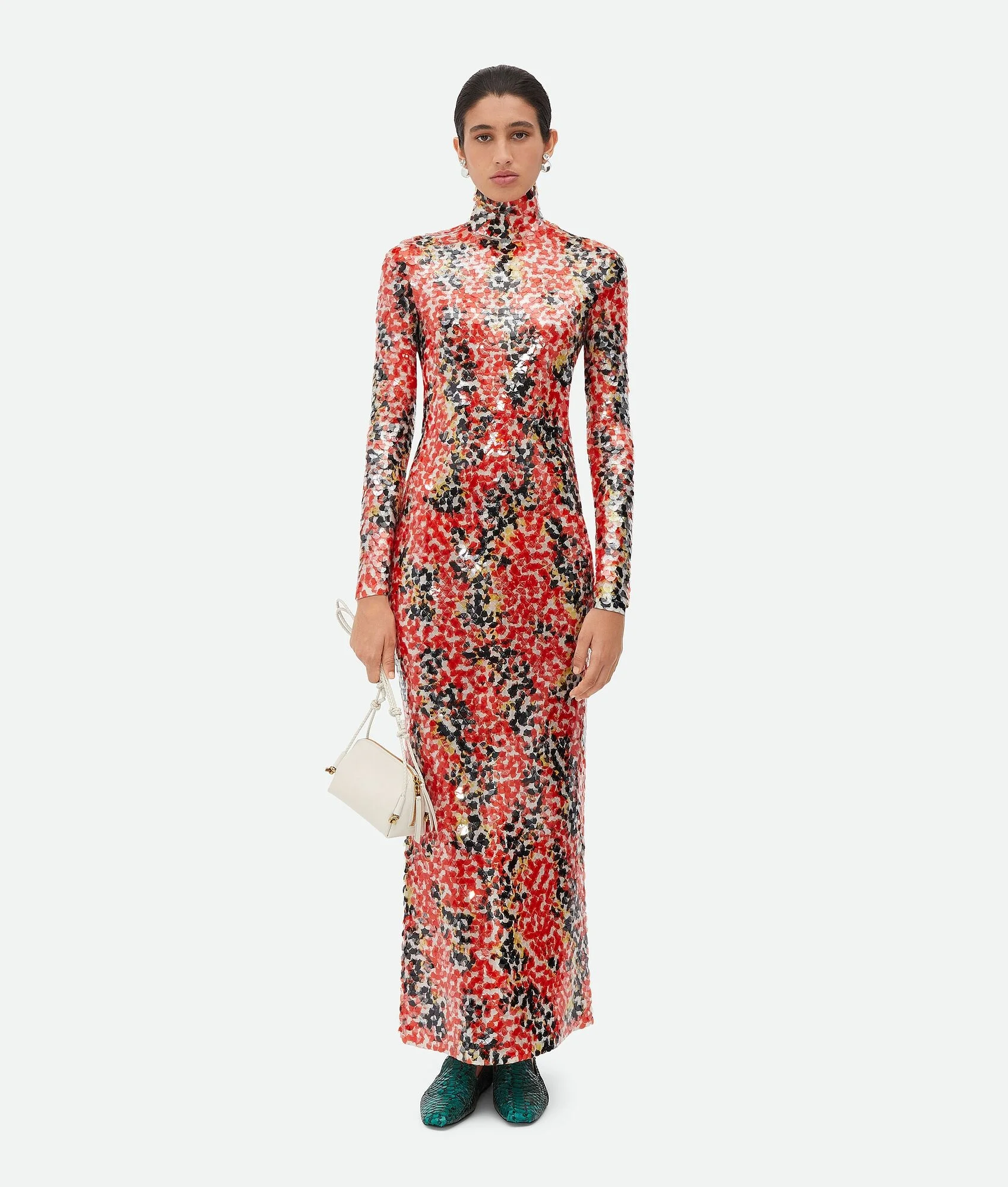 Long dress realised with shiny starfish pattern sequins and knitted viscose. Product Details - Printed sequins cotton knitted long dress - Zipper closure - Unlined - Material: 81% cotton, 19% polyamide - Color: Tulip/Zest/Black - Made in: Italy - Product code: 776214V57K06130 Size & Fit - Model is 176 cm | 5'9" and is wearing a Bottega Veneta size S