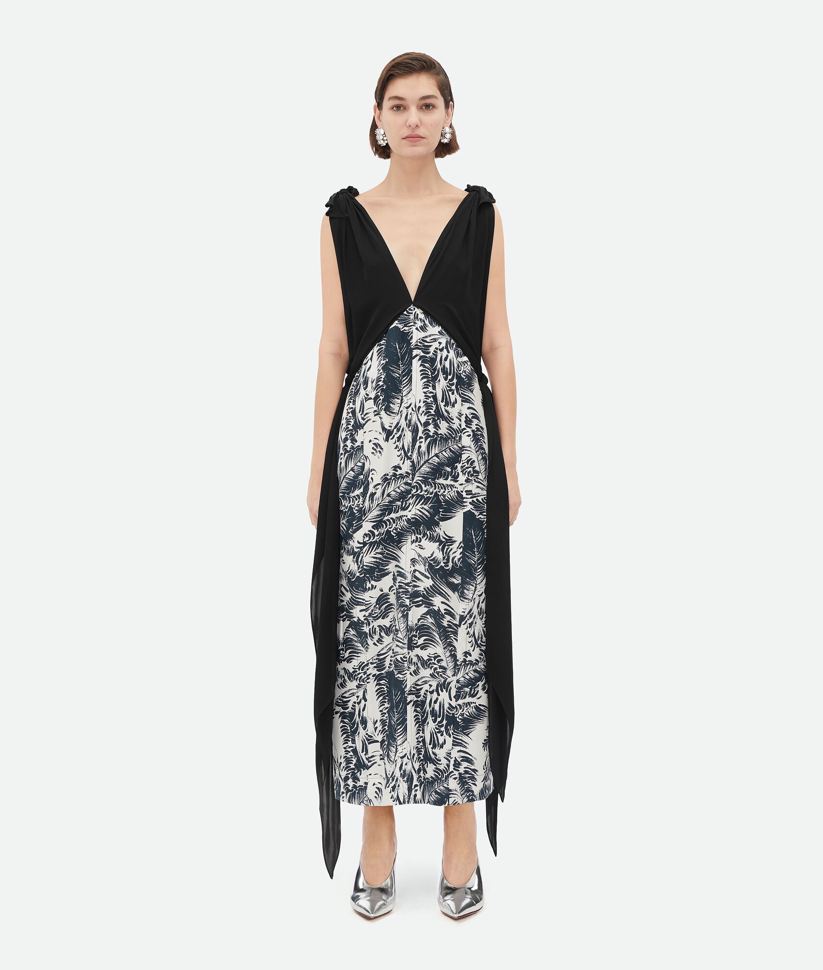 Silk long dress. Product details • Silk long dress • Feather print pattern • Zipper closure • Unlined • Regular fit Material: 100% Silk • Color: Black/Chalk/Inkwell Made in: Italy Size & fit • Model is 178 cm | 5'10" and is wearing a Bottega Veneta size 38