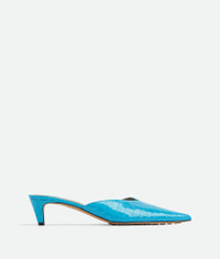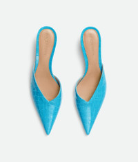 • Croc-embossed glossy leather mules Material: 100% Calfskin • Lining: Lambskin • Color: Pool • Bio-based rubber-injected and biodegradable leather outsole • Heel: 4 cm | 1.6" Made in: Italy