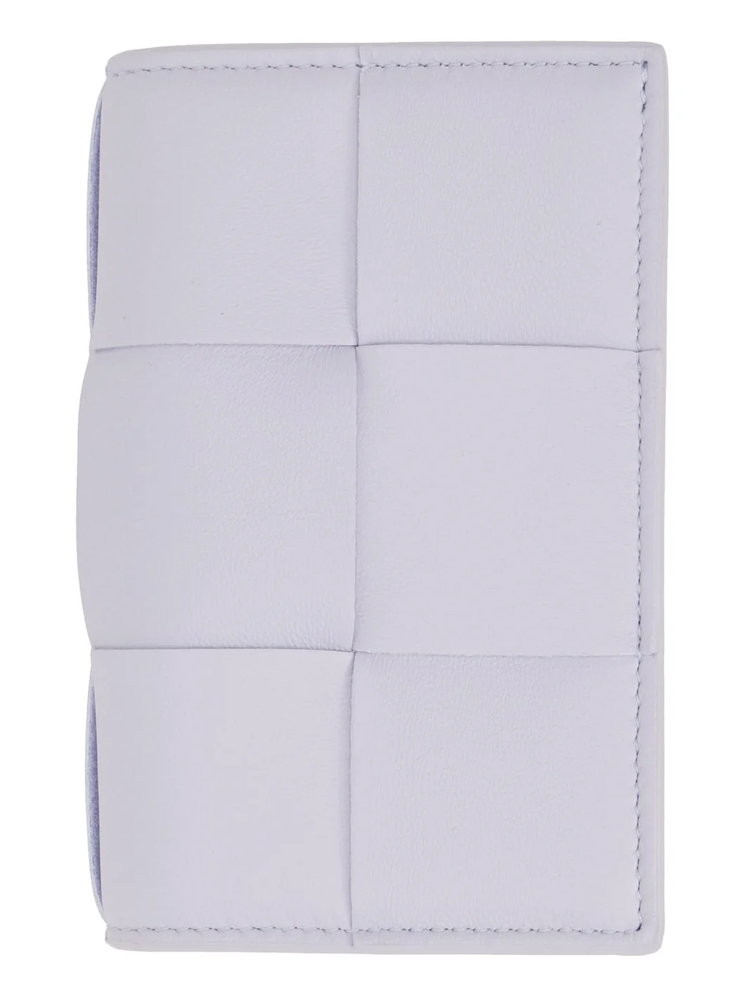 Intreccio-woven buffed lambskin card holder in purple. Burnished edges throughout. · Press-stud closure · Card slot and note slot · Buffed calfskin lining · H3 x W4.5 x D1 in Supplier color: Oyster grey Lambskin. Made in Italy 232798F037026