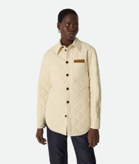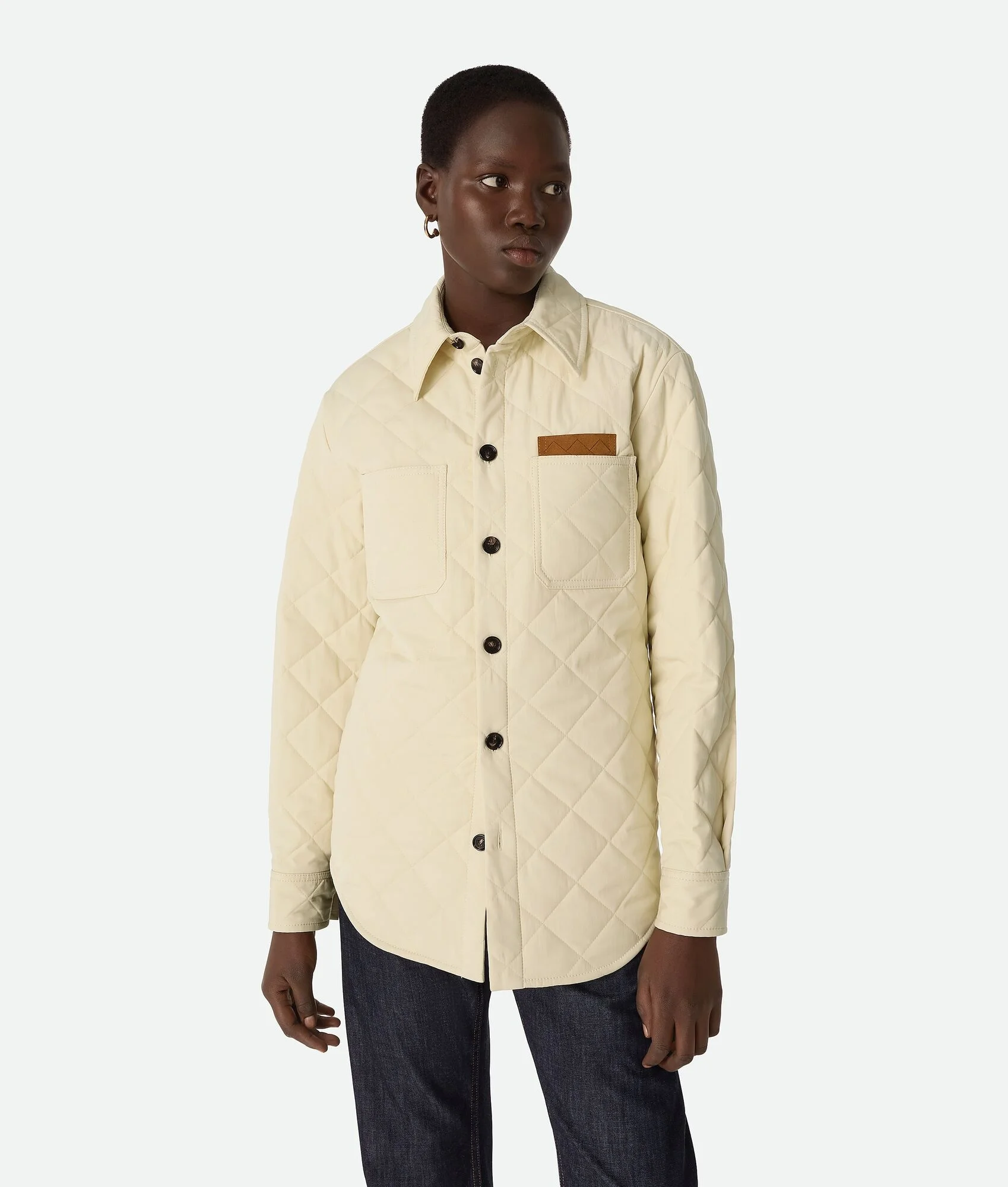 Quilted overshirt in lightweight matte technical cotton with Intrecciato suede patch. Product Details - Lightweight matte tech cotton quilted overshirt - Intrecciato suede front patch - Button closure - Regular fit - Color: Sea Salt - Made in: Italy - Product code: 835221V5O609028 Size & Fit - Model is 178 cm | 5'10" and is wearing a Bottega Veneta size 38