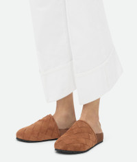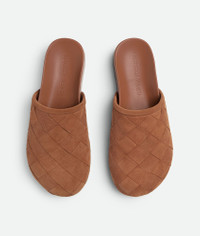 Open back clog in padded Intrecciato leather with ergonomic leather insole. Product Details - Padded Intrecciato suede mule clog - Ergonomic leather insole - Material: Calfskin - Lining: Lambskin - Color: Caramel - Rubber outsole - Made in: Italy - Product code: 796701V3QE07665